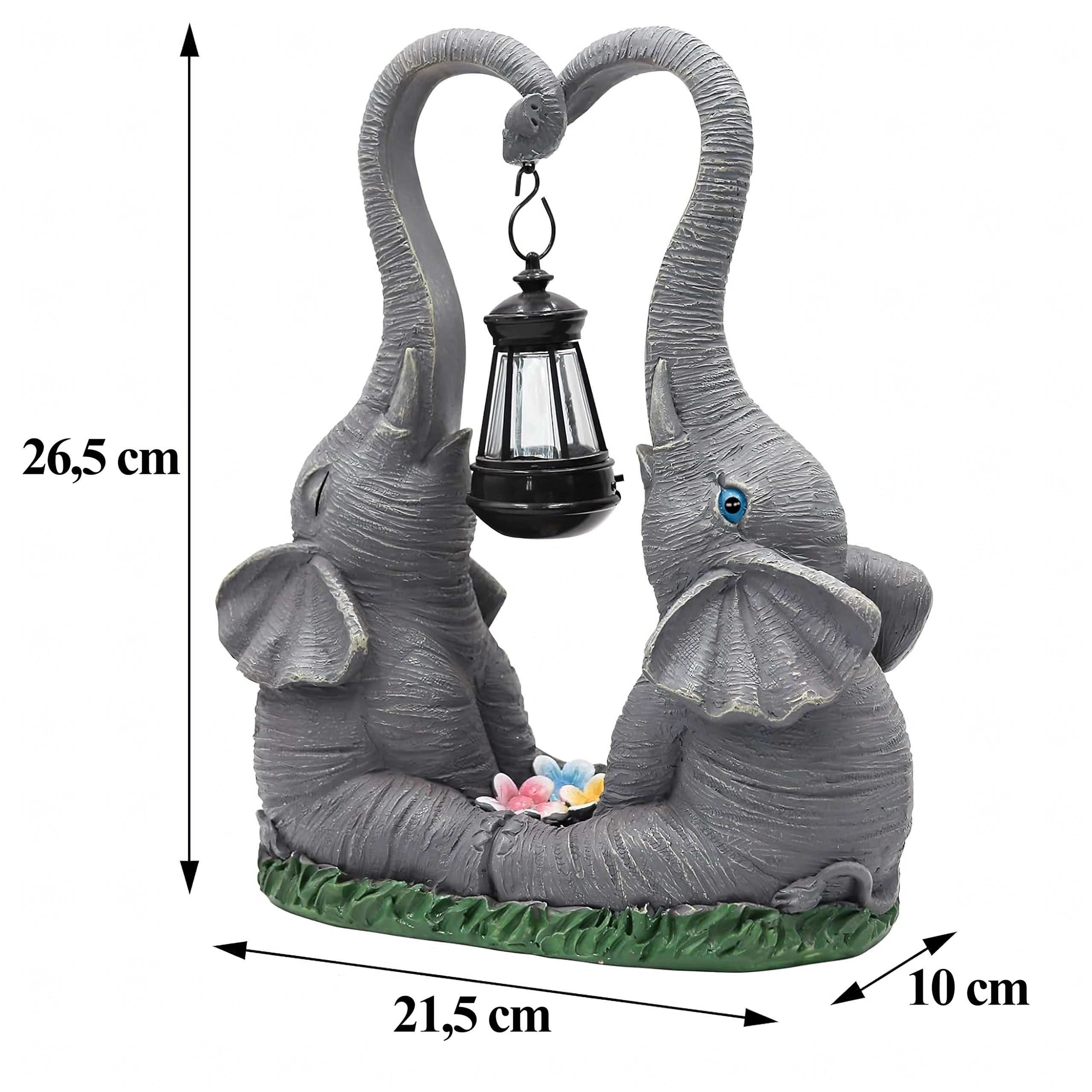 Deliziosa decorazione da giardino con due elefanti le cui proboscidi formano un cuore, che reggono una lanterna sospesa con luce LED calda. La resistente statuina in resina è perfetta per giardino, terrazza e balcone e alla sera crea una piacevole atmosfera. Ideale come idea regalo e come tocco di stile per l’illuminazione esterna.