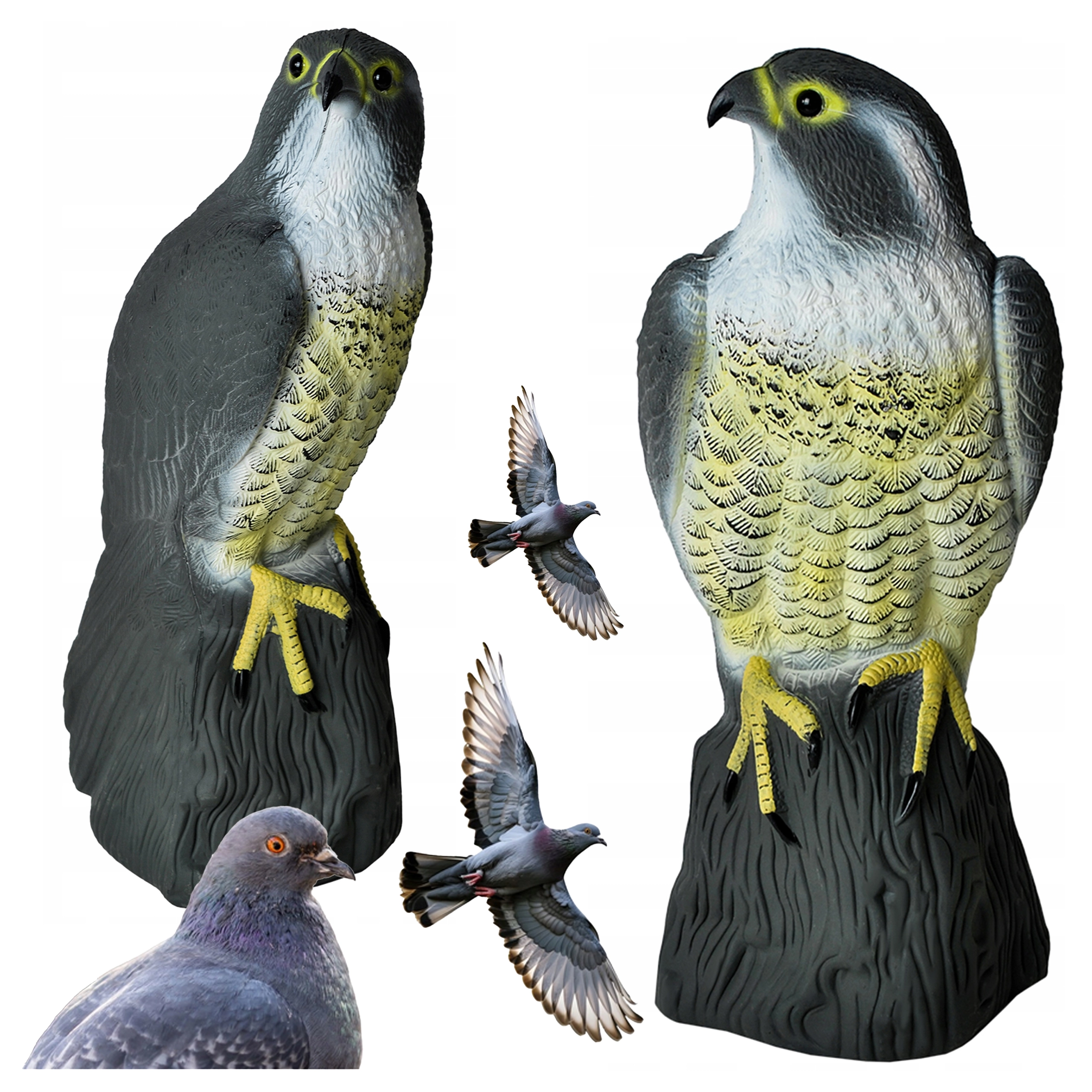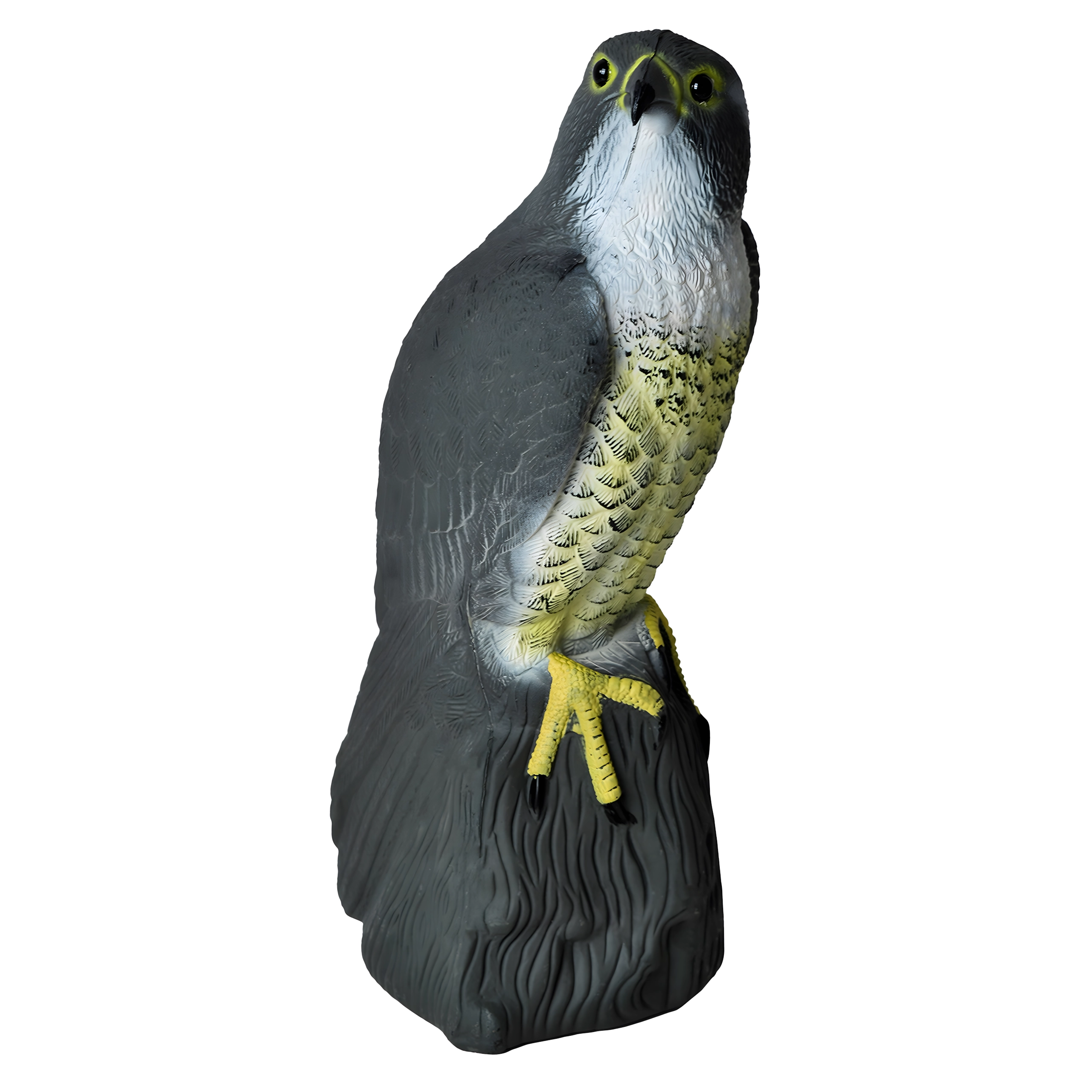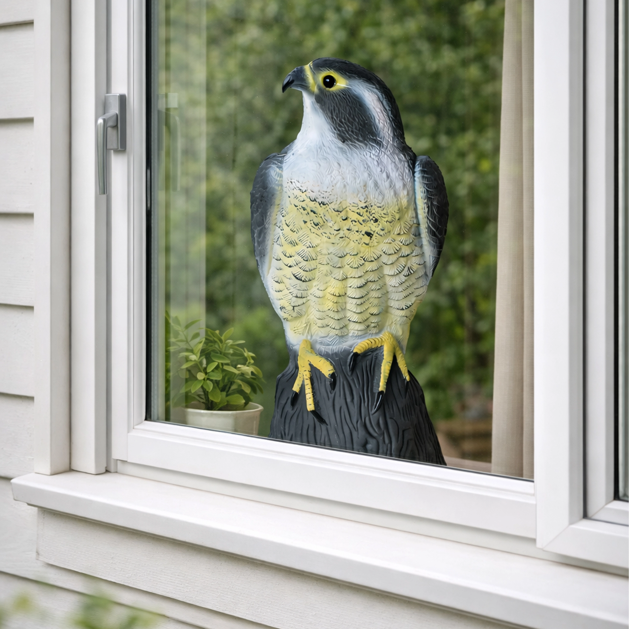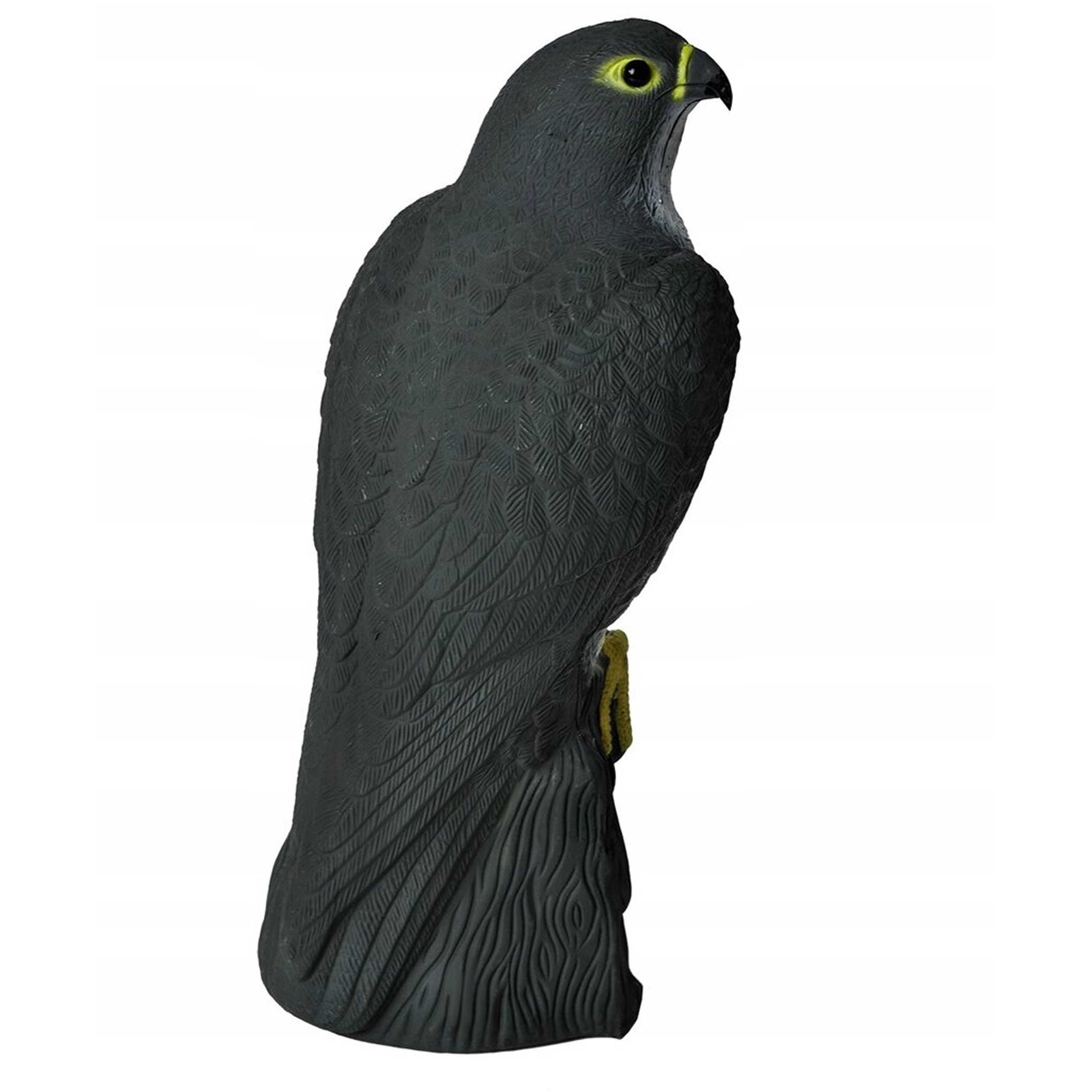 La colorazione fedele, la texture del piumaggio e la postura naturale del falco aumentano l’effetto psicologico sui piccoli uccelli e impediscono loro di posarsi.