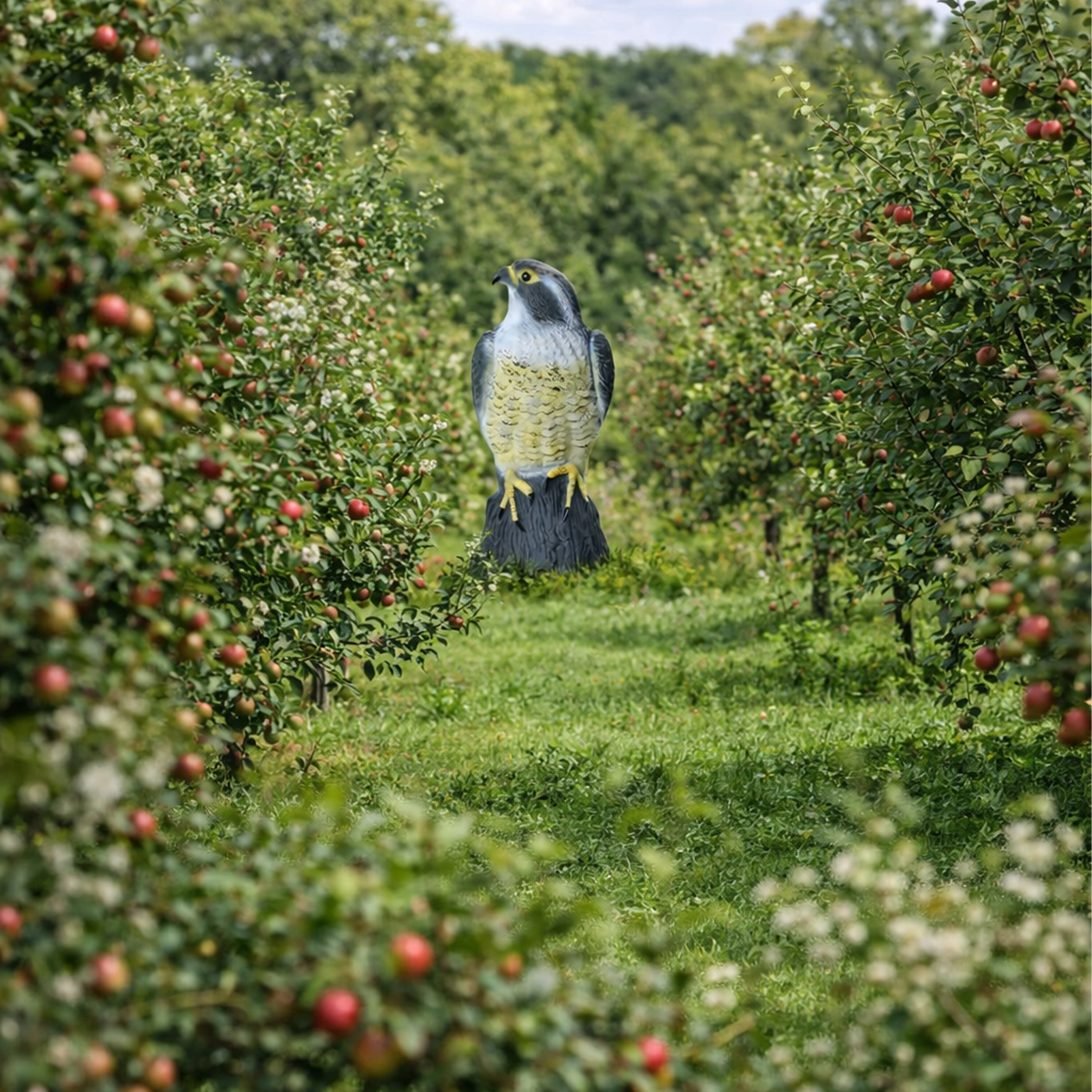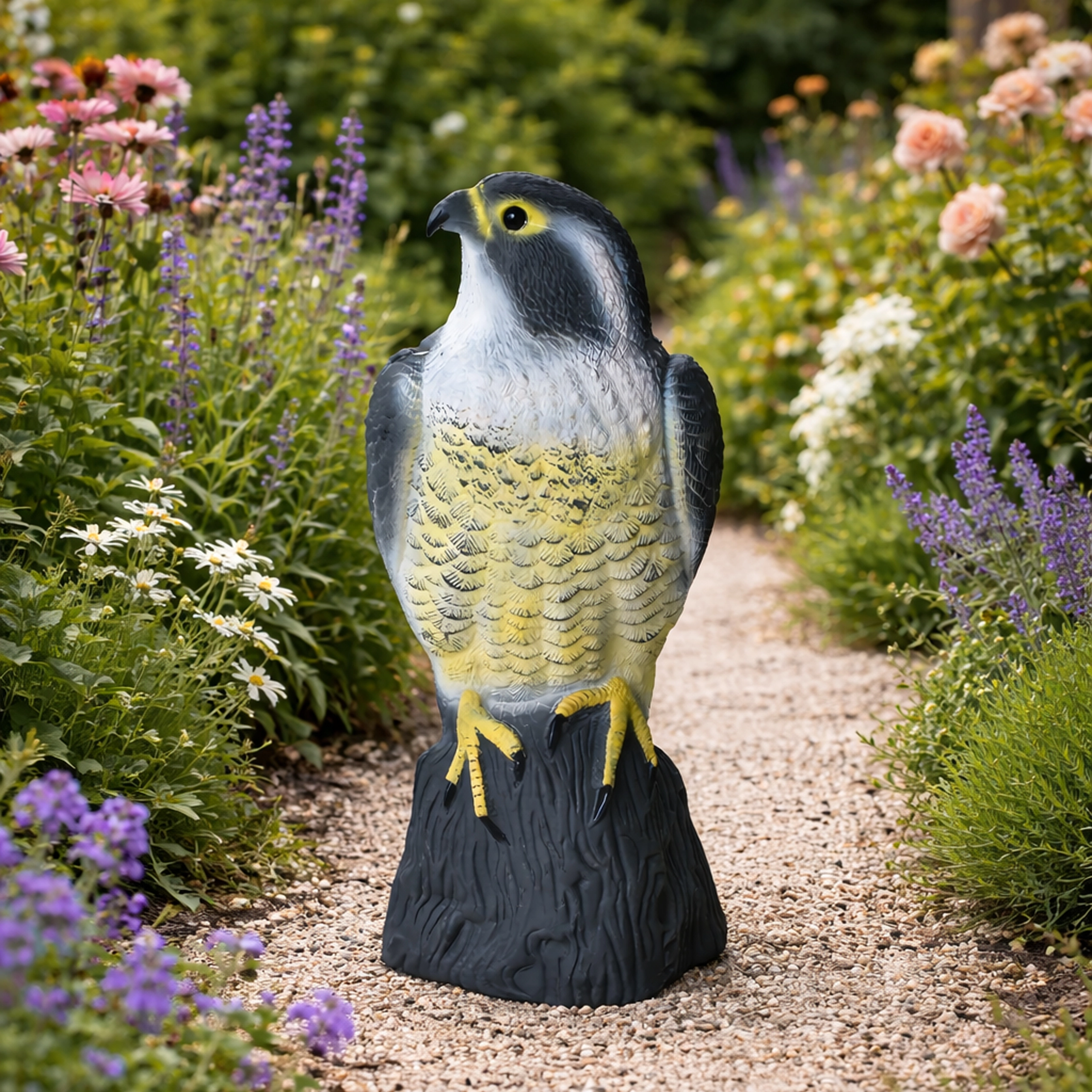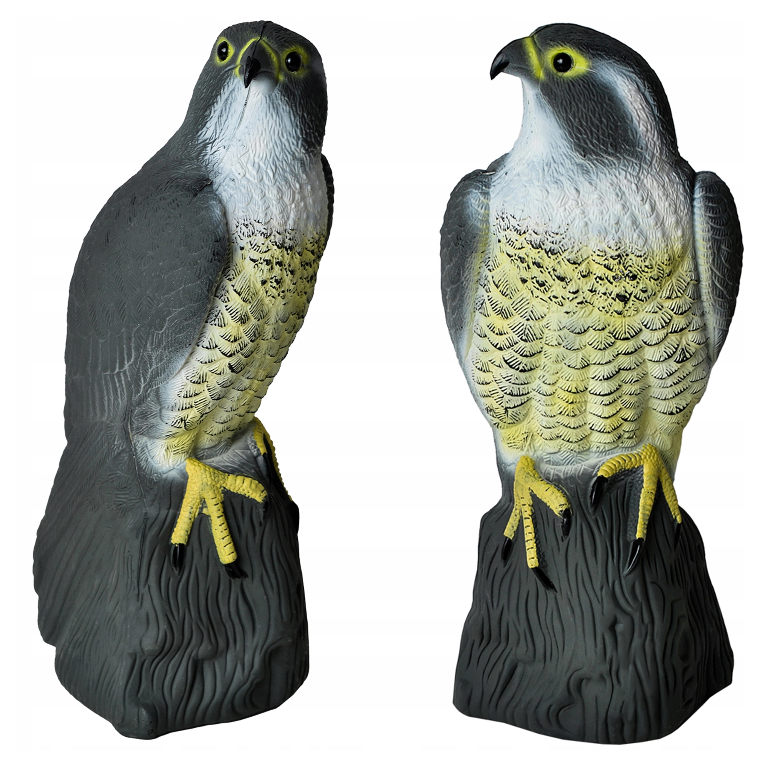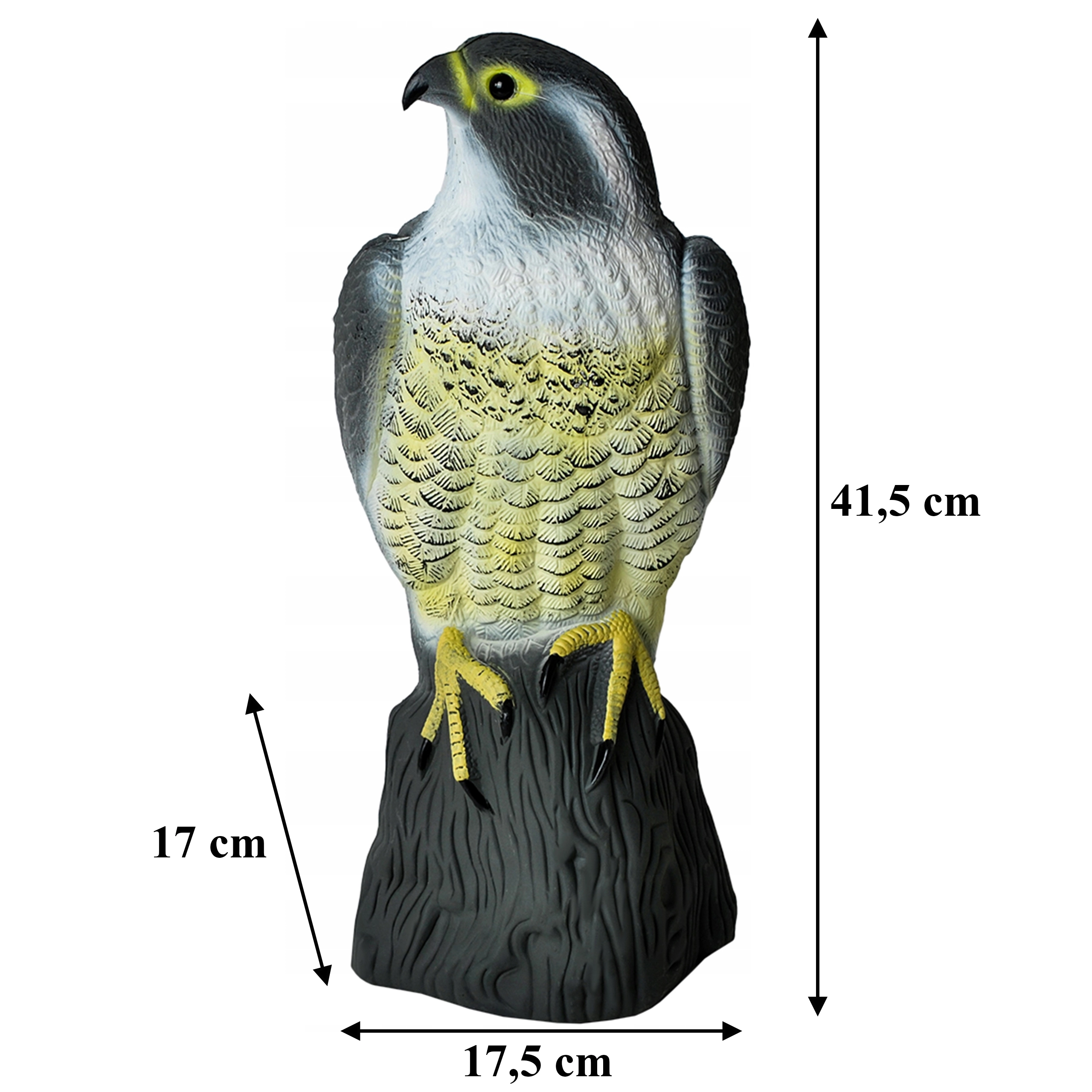 La colorazione fedele, la texture del piumaggio e la postura naturale del falco aumentano l’effetto psicologico sui piccoli uccelli e impediscono loro di posarsi.