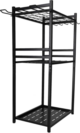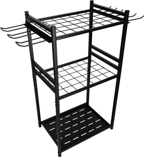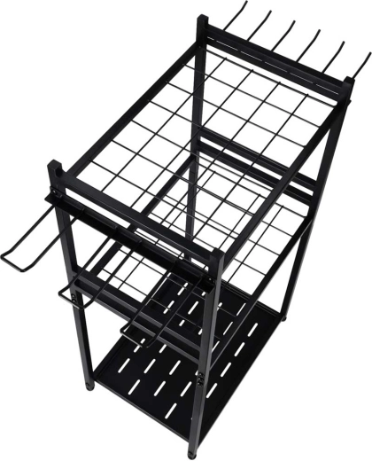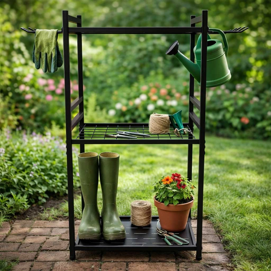 Mantieni giardino, garage e officina perfettamente organizzati con il supporto in metallo LUARO. Grazie ai tre livelli di ripiani e ai ganci laterali ottieni una disposizione ordinata degli attrezzi, accesso rapido e una struttura stabile e resistente per l’uso quotidiano.