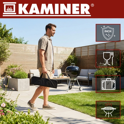 Il pratico set di utensili da barbecue KAMINER mantiene tutto in ordine in una solida custodia, così hai sempre gli attrezzi a portata di mano. Include 5 accessori di base in acciaio inox con manici lunghi per lavorare in maggiore sicurezza vicino al calore; ogni pezzo ha un gancio per appenderlo. Grazie alla custodia organizzata con fissaggi elastici, trasporto e stoccaggio sono rapidi e ordinati.