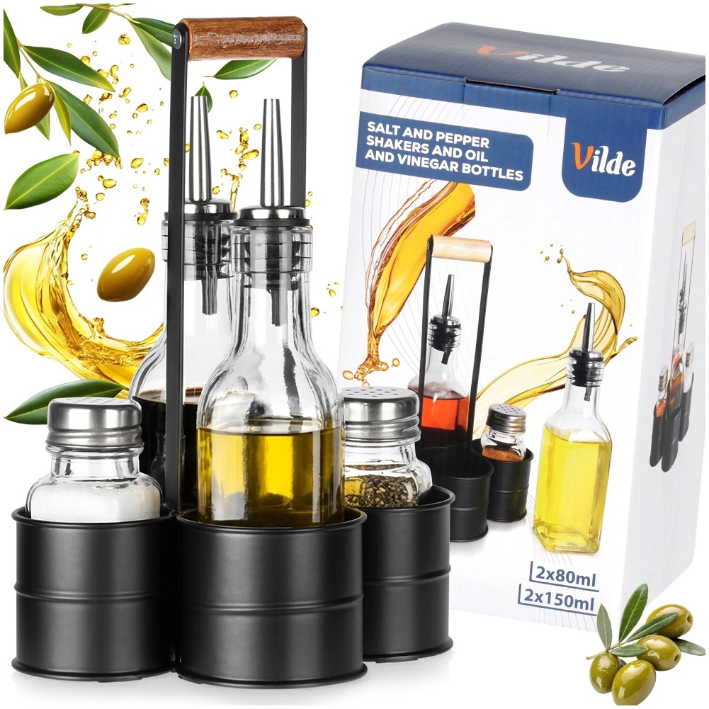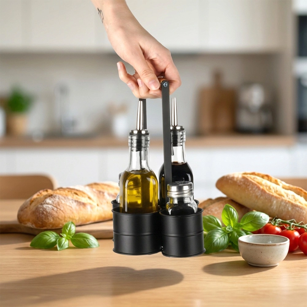Questo set dal design curato unisce funzionalità ed estetica: due bottiglie da 150 ml (4,5 × 4,5 × 20 cm) per olio e aceto con beccucci dosatori in acciaio inox per un servizio fluido e pulito, completate da saliera e pepiera da 80 ml (4 × 4 × 9,5 cm). Il tutto è riposto in un solido supporto in metallo (16,5 × 13,5 × 23 cm) con manico in legno per un facile trasporto.