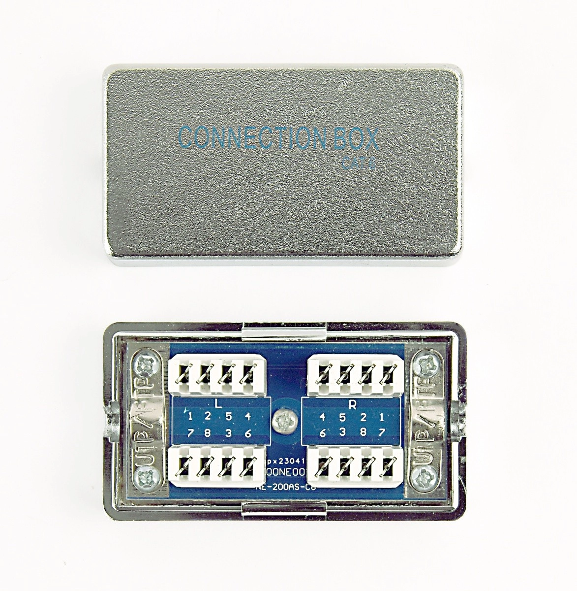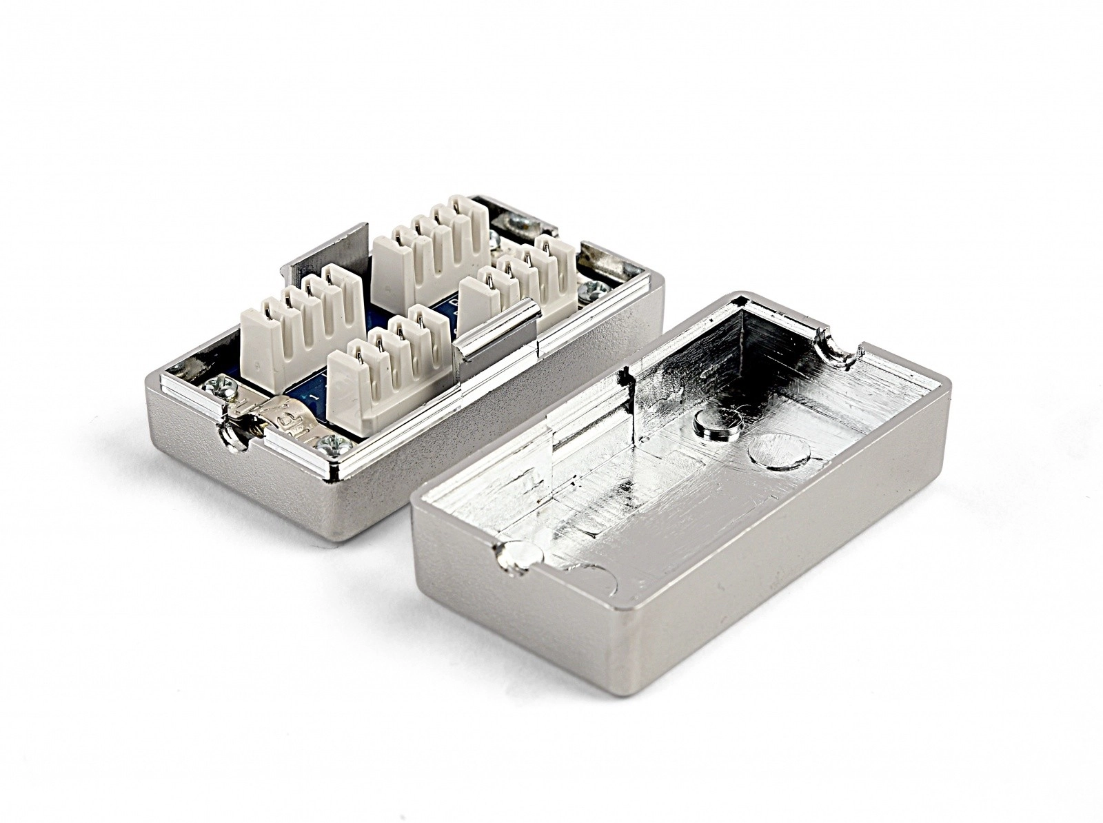 La pratica scatola con coperchio rimovibile facilita installazione e manutenzione. La costruzione robusta è adatta al montaggio in-line nei quadri, nelle reti d'ufficio e domestiche.
