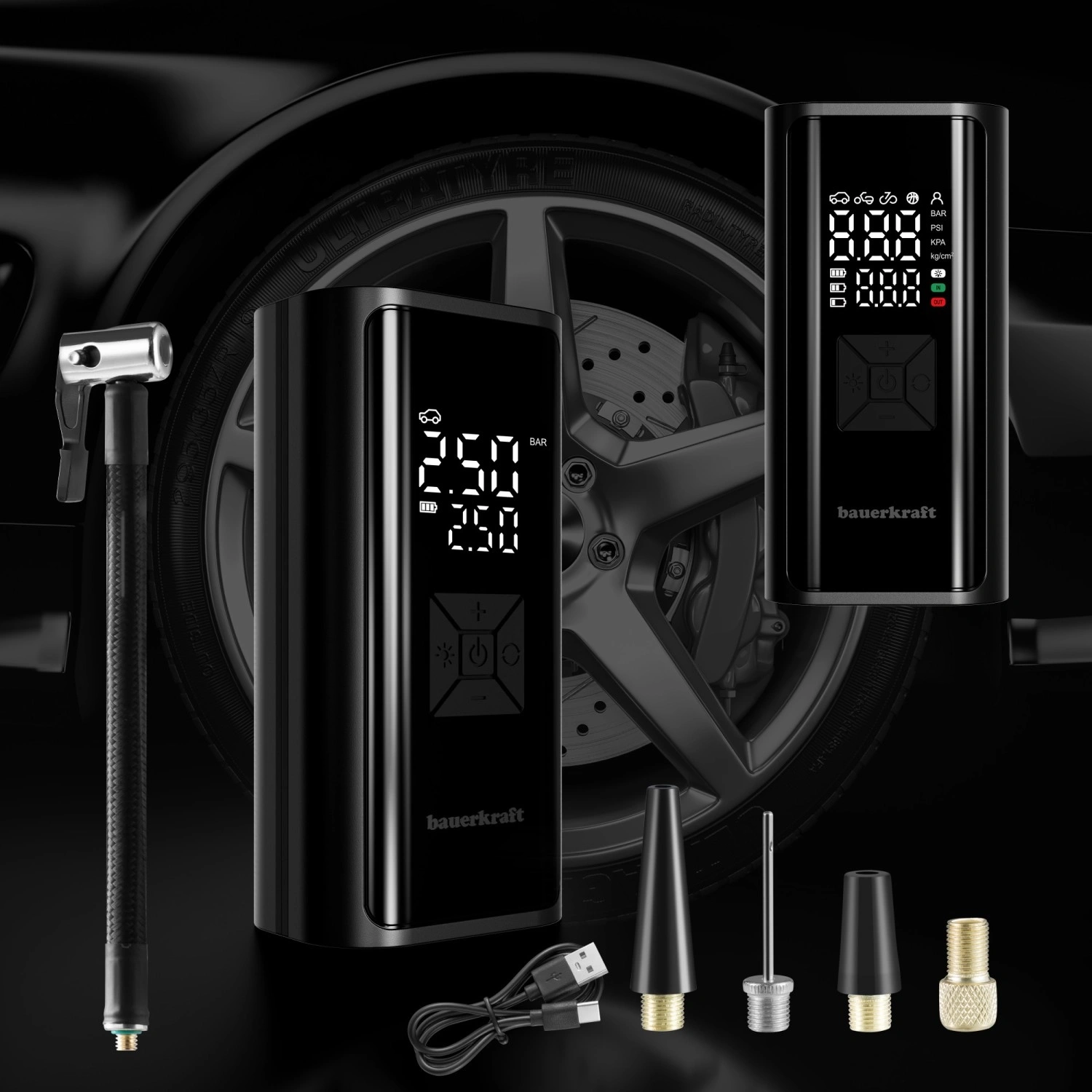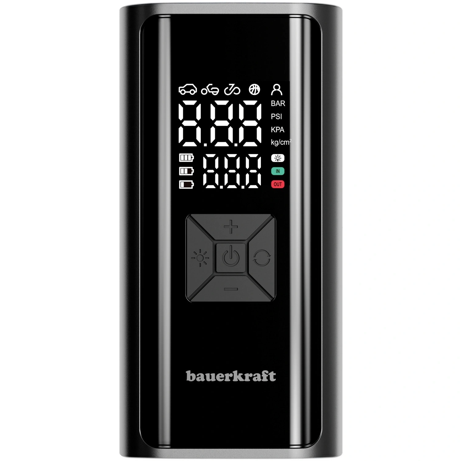 Monitora pressione e livello della batteria in tempo reale. Imposta il valore desiderato e il compressore si spegne automaticamente al raggiungimento della soglia impostata: sicuro e senza sovraggiungere.