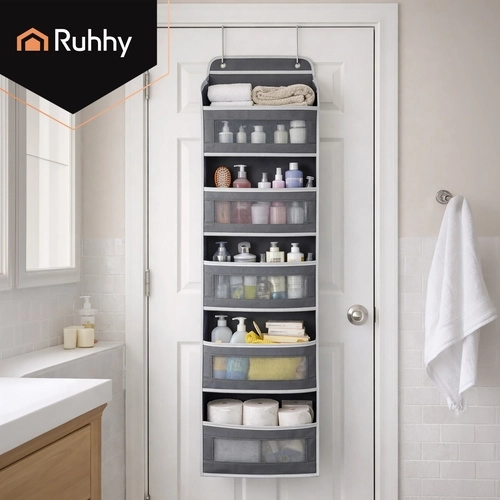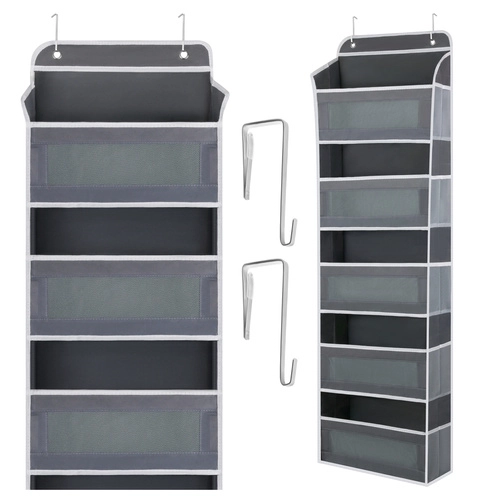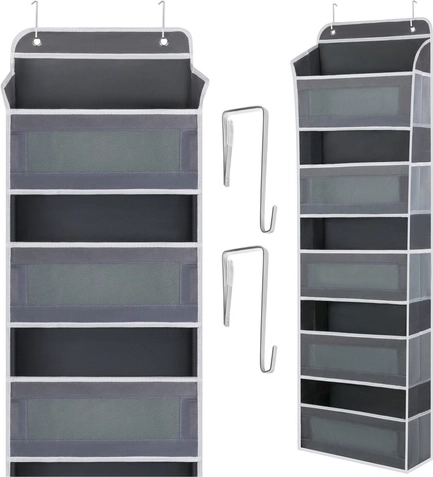 Si appende facilmente alla porta con ganci metallici e offre subito 5 ripiani e tasche laterali per un'organizzazione efficiente.