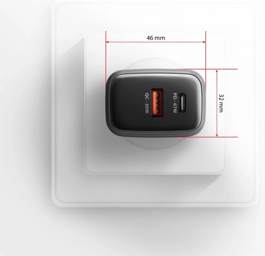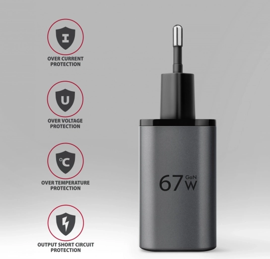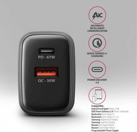 Potente caricatore da rete con la più recente tecnologia GaN che offre alta efficienza in un corpo compatto. La porta USB‑C PD 3.0 (fino a 67 W) è ideale per notebook, tablet e smartphone moderni, mentre USB‑A QC 3.0/4+ assicura una ricarica fulminea dei telefoni compatibili. Il supporto PPS garantisce prestazioni ottimali anche per i dispositivi più esigenti.