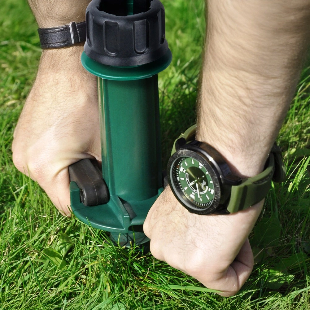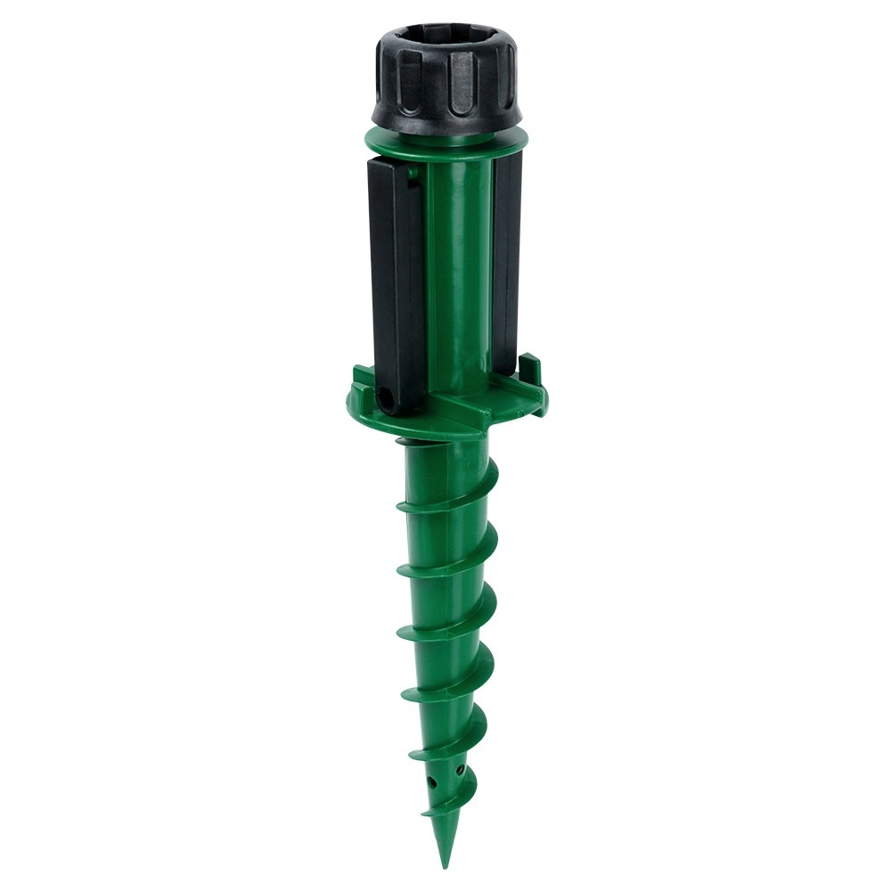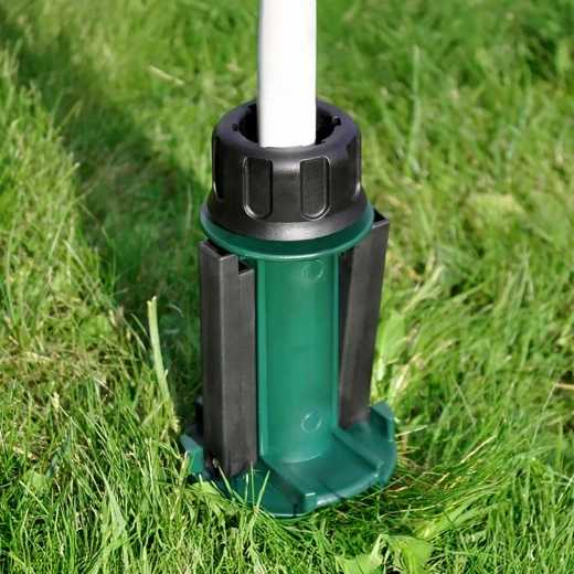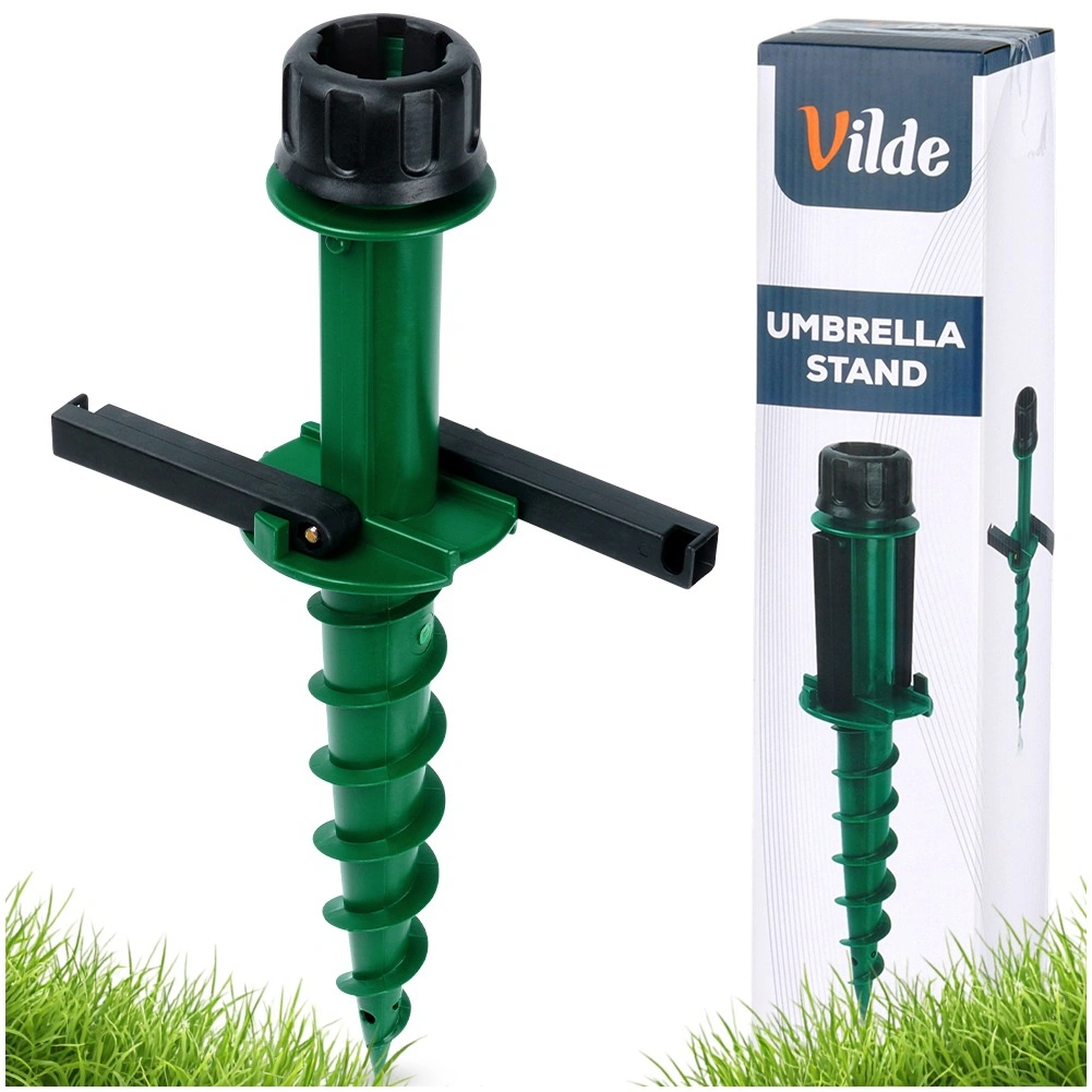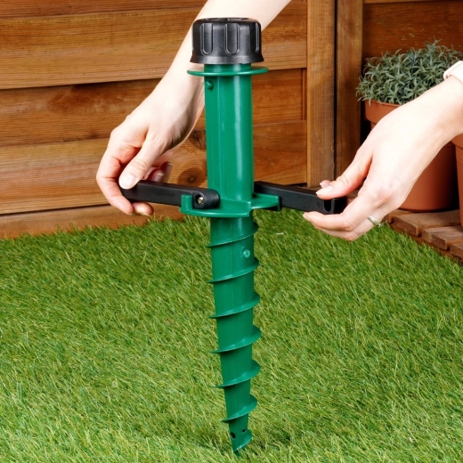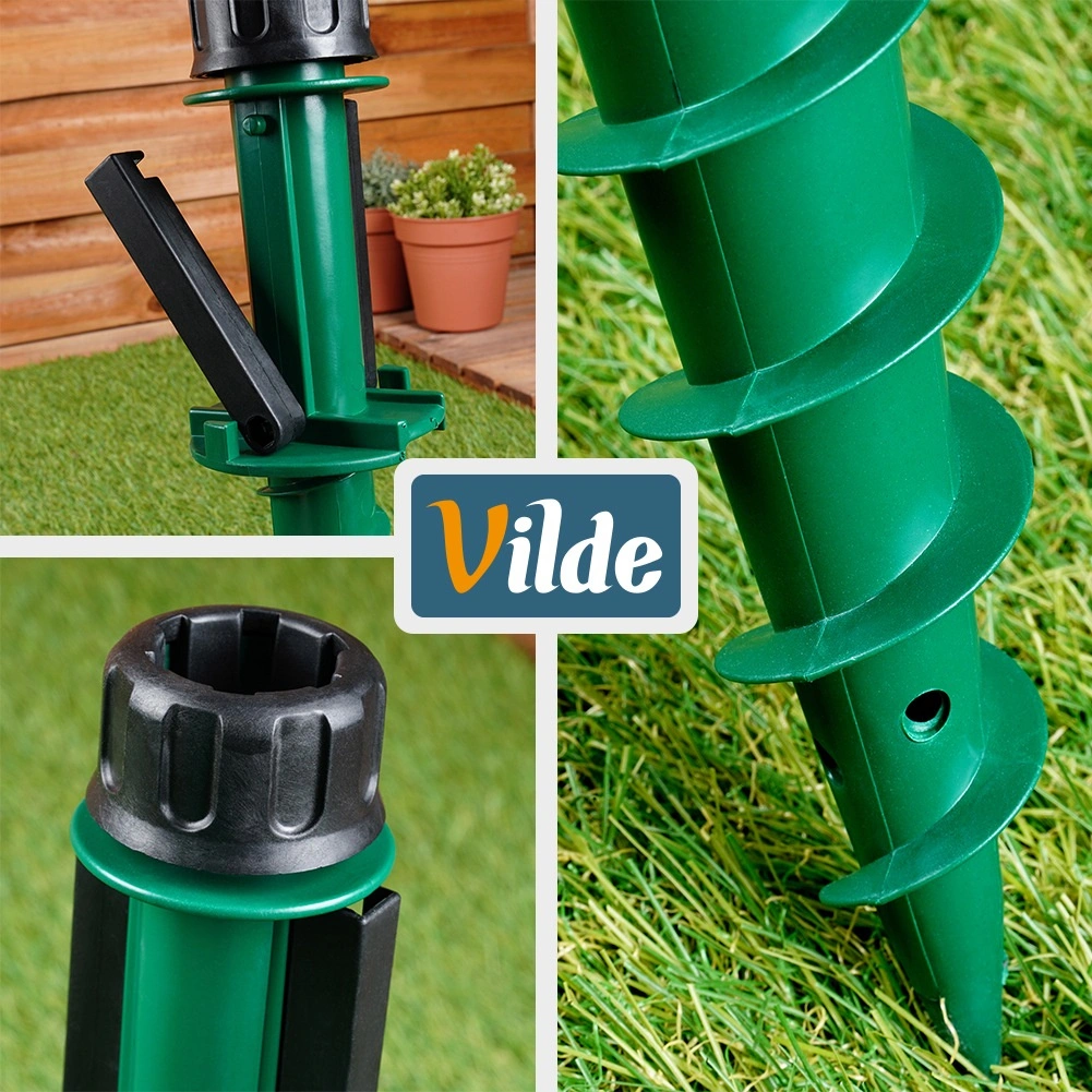 Il collare di serraggio superiore si adatta ai diametri più comuni dei pali degli ombrelloni (ca. 2,2–3,3 cm) e li mantiene fermi in posizione. Le maniglie laterali ribaltabili offrono leva per un facile avvitamento e rimozione dal terreno. Scelta ideale per giardino, spiaggia, casa vacanze e campeggio, senza bisogno di pesanti basi in cemento.