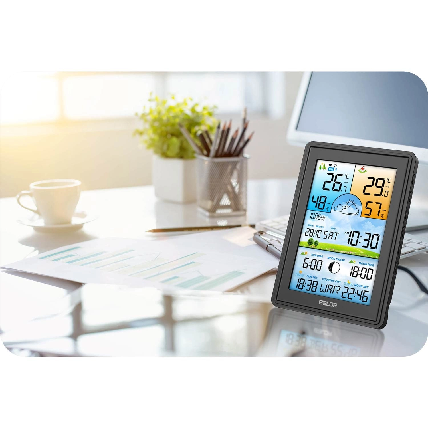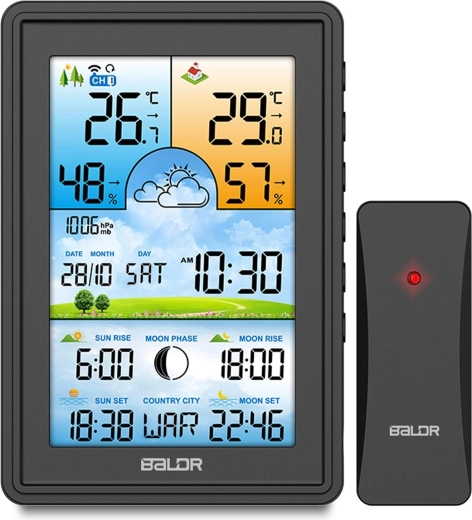 Elegante stazione meteo digitale con sensore wireless che offre previsioni precise per 12–24 ore, misurazione di temperatura e umidità interna ed esterna, barometro, sincronizzazione oraria DCF77 e orari di alba/tramonto di Sole e Luna. Display LCD a colori ben leggibile con 4 livelli di retroilluminazione, allarme gelo e allarme di temperatura per un uso comodo e sicuro in casa e in giardino.