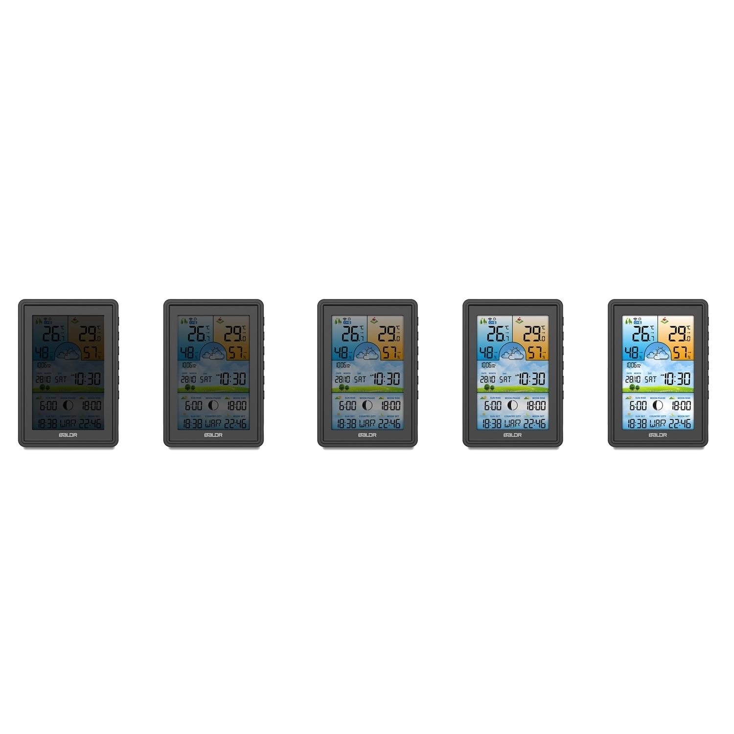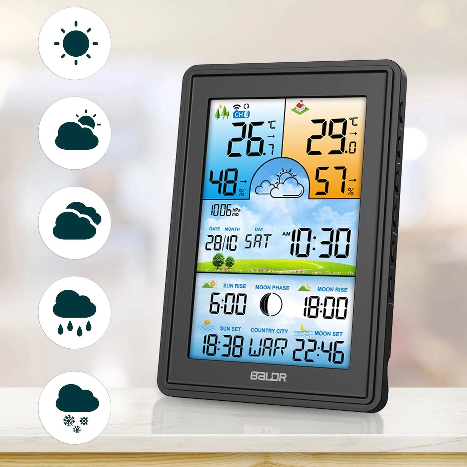Il grande display LCD a colori mostra temperatura e umidità interne ed esterne, pressione barometrica e icone dell’evoluzione del meteo. Non mancano le fasi lunari e gli orari di alba e tramonto di Sole e Luna. La retroilluminazione è regolabile su 4 livelli (100/50/10/3 %) o completamente disattivabile. Il sensore wireless con portata fino a 60 m garantisce una trasmissione stabile dei dati e la possibilità di espansione con sensori aggiuntivi.