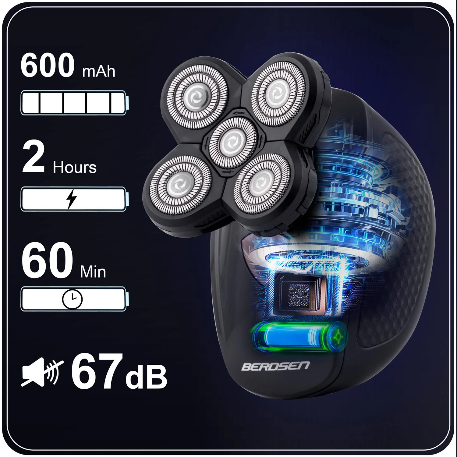 - Testina con lame rotanti – segue dolcemente i contorni del viso per una rasatura profonda.