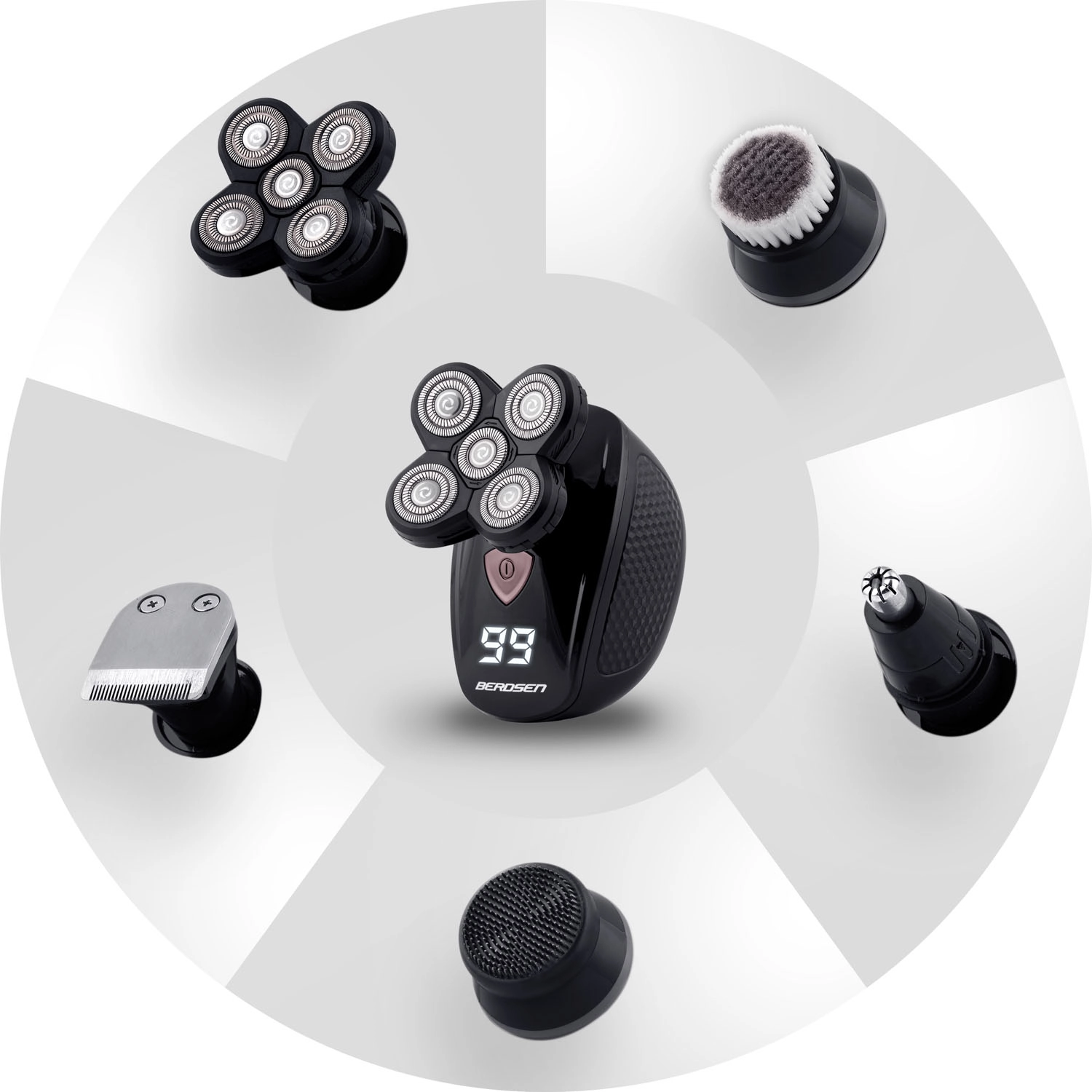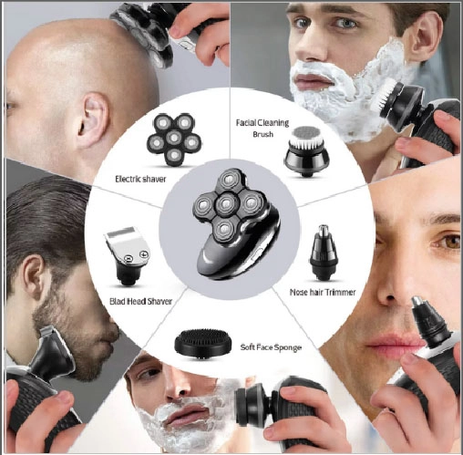 - 5 pz: testina rotante, testina di precisione/trimmer, trimmer naso/orecchie, testina con spugna, testina con spazzola