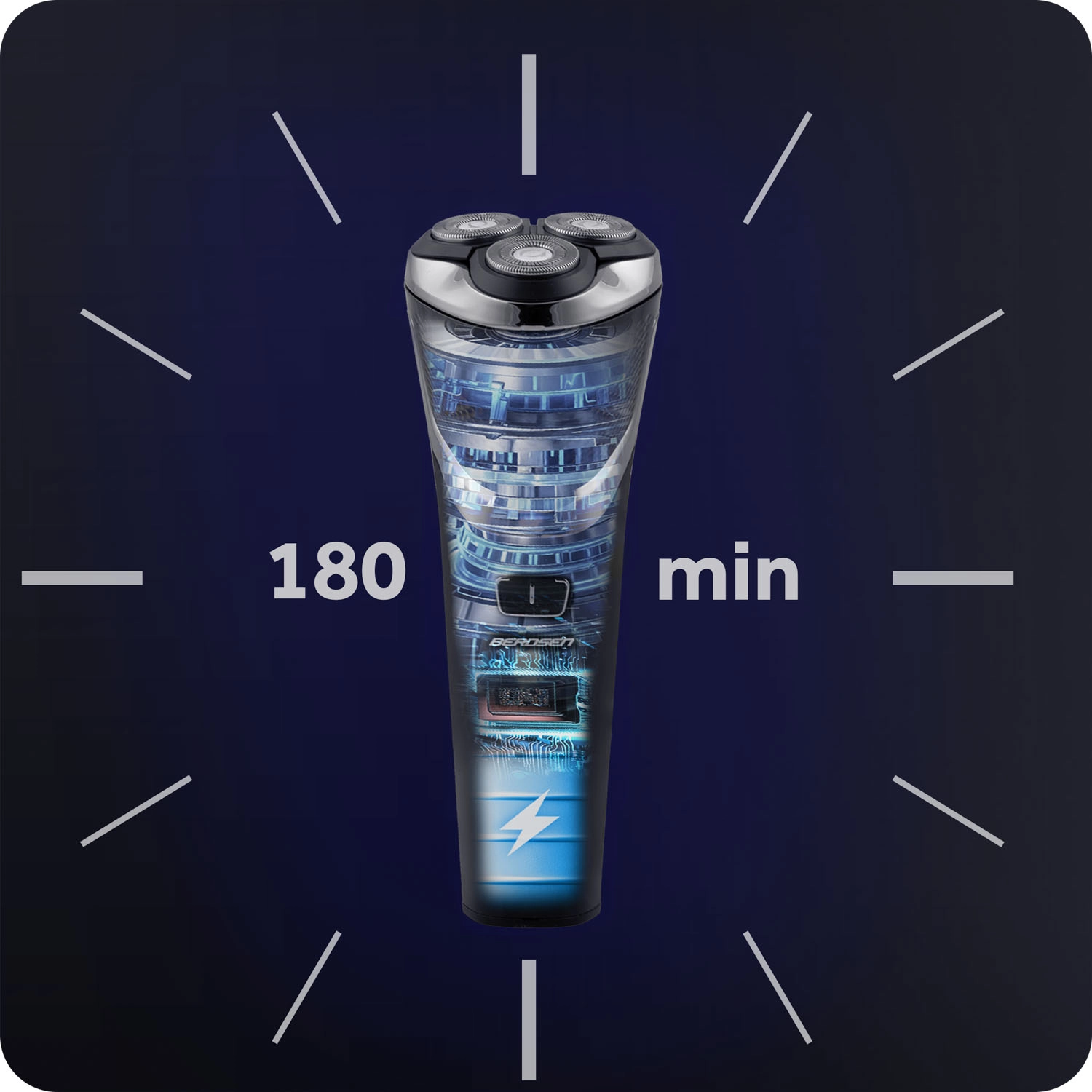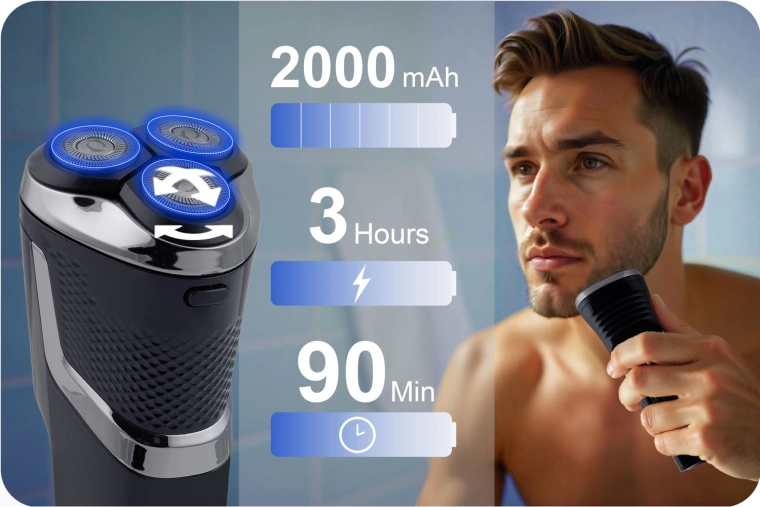 Il motore potente assicura prestazioni stabili, mentre la batteria Li‑Ion da 2000 mAh offre fino a 3 ore di uso continuo. Grazie alla ricarica rapida tramite USB‑C il rasoio è pronto in 1,5 ore. Il design compatto ed ergonomico si adatta perfettamente alla mano e la funzione Travel Lock evita accensioni accidentali in viaggio.