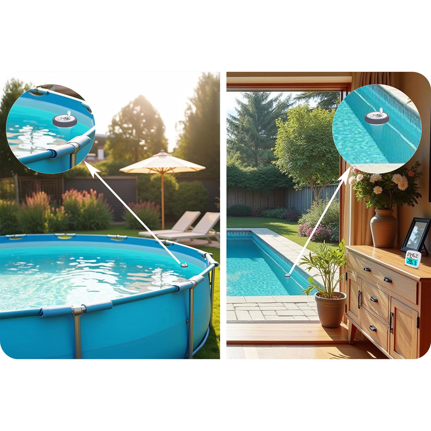 Il sensore galleggiante rileva con precisione la temperatura dell’acqua e invia i dati all’unità interna: ideale per piscine domestiche e vasche idromassaggio.