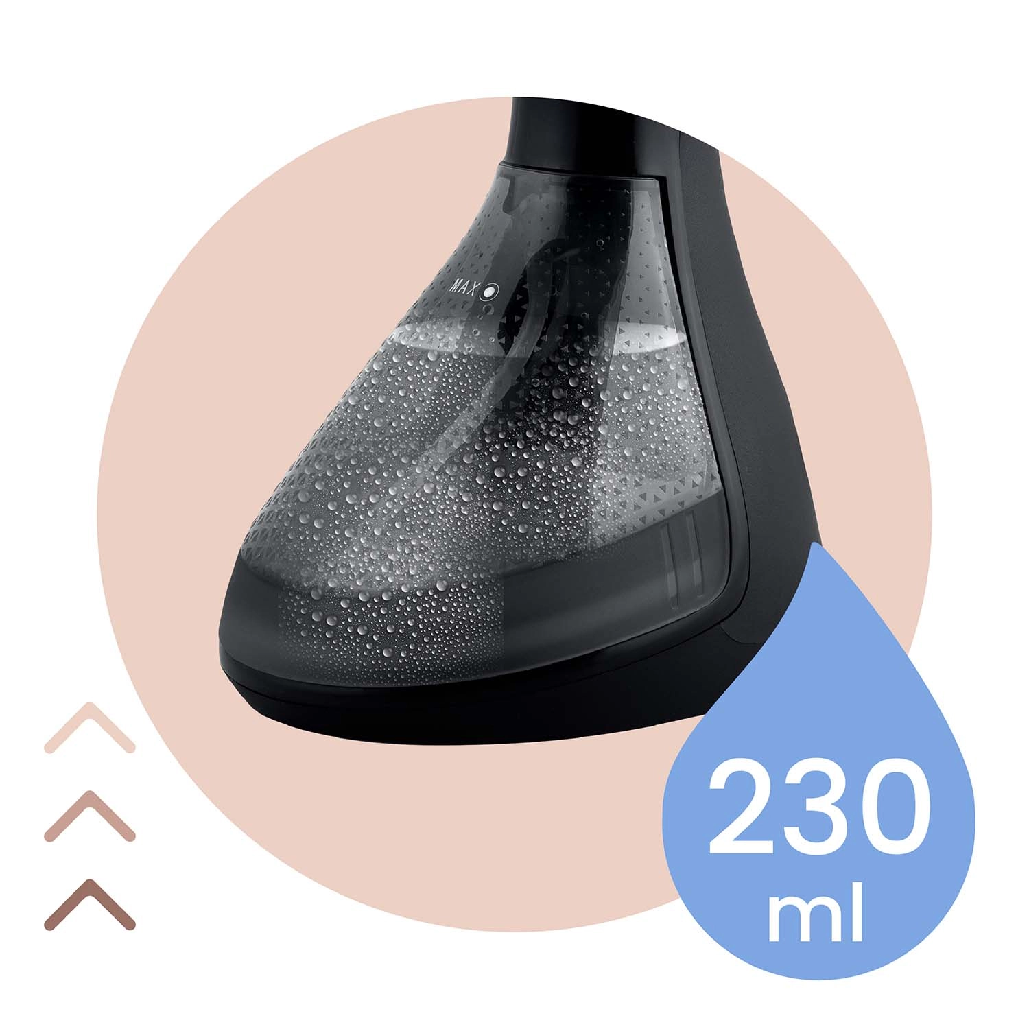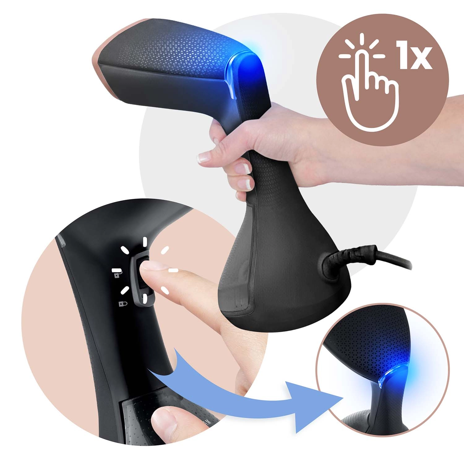 Il design ben studiato garantisce comfort nell’uso quotidiano e in viaggio. Il capiente serbatoio removibile da 230 ml con galleggiante consente una vaporizzazione continua anche in posizione orizzontale e il cavo lungo 2 m offre ampia libertà di movimento. Con un solo pulsante avvii il dispositivo e generi subito vapore. In dotazione l’accessorio con spazzola per vaporizzare e pulire le fibre contemporaneamente e il pratico imbuto di riempimento.