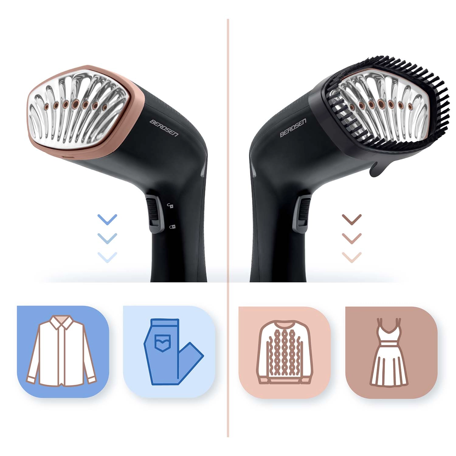 - Ampia versatilità: senza accessorio per tessuti lisci e resistenti (camicie, pantaloni, cotone); con accessorio spazzola per materiali delicati (maglieria, seta, abiti leggeri) e imbottiti.