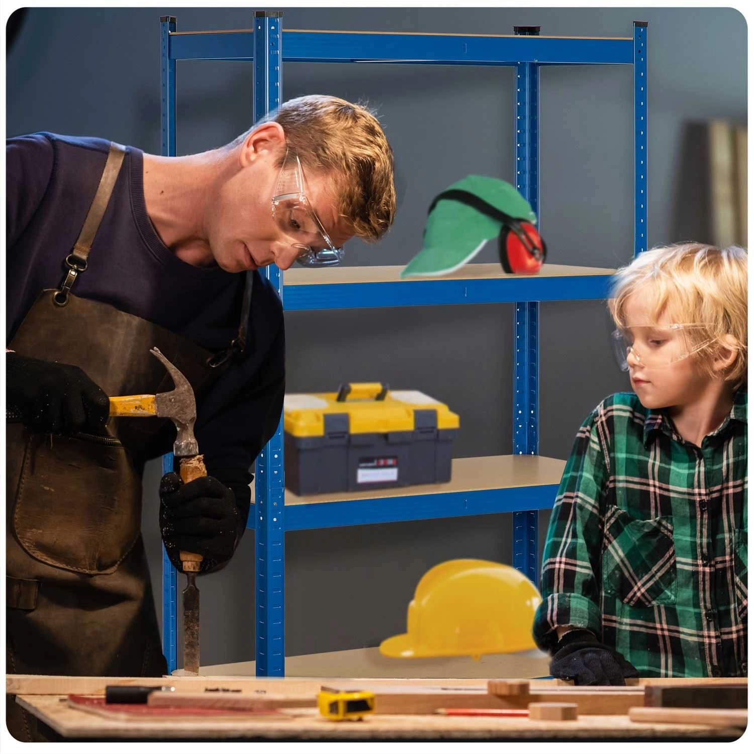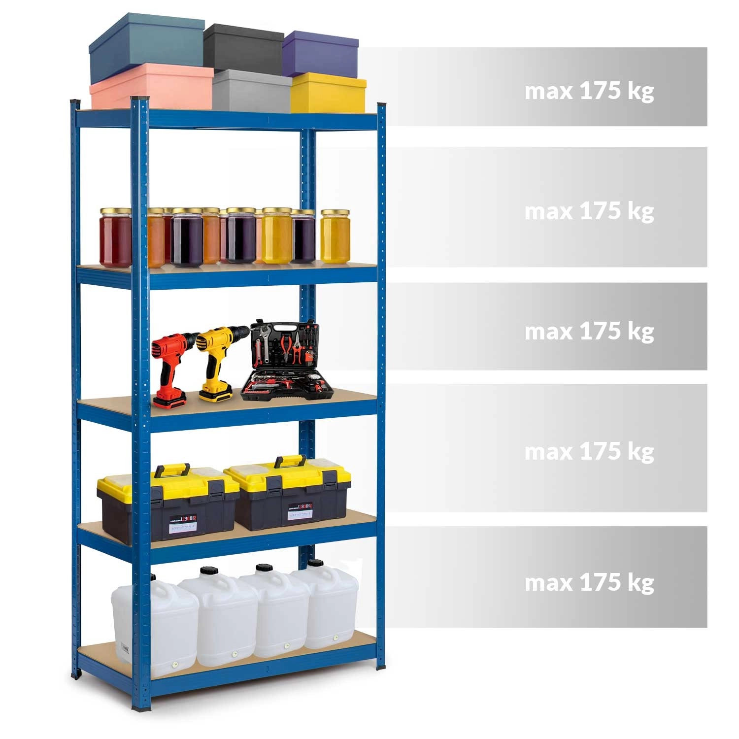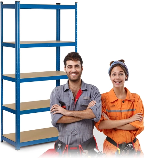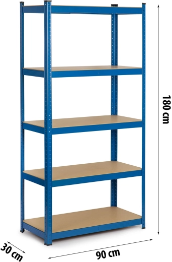 Scaffale metallico universale HUMBERG in colore blu, dimensioni 180 × 90 × 30 cm, con 5 ripiani in MDF robusti, portata totale fino a 875 kg e montaggio a incastro senza viti. Grazie all’altezza dei ripiani regolabile, alla possibilità di dividerlo in due scaffali più piccoli o di usarlo come banco da lavoro, è ideale per garage, cantina, officina, archivio e magazzino. Bordi arrotondati e tappi di protezione per i piedi garantiscono sicurezza e proteggono il pavimento.
