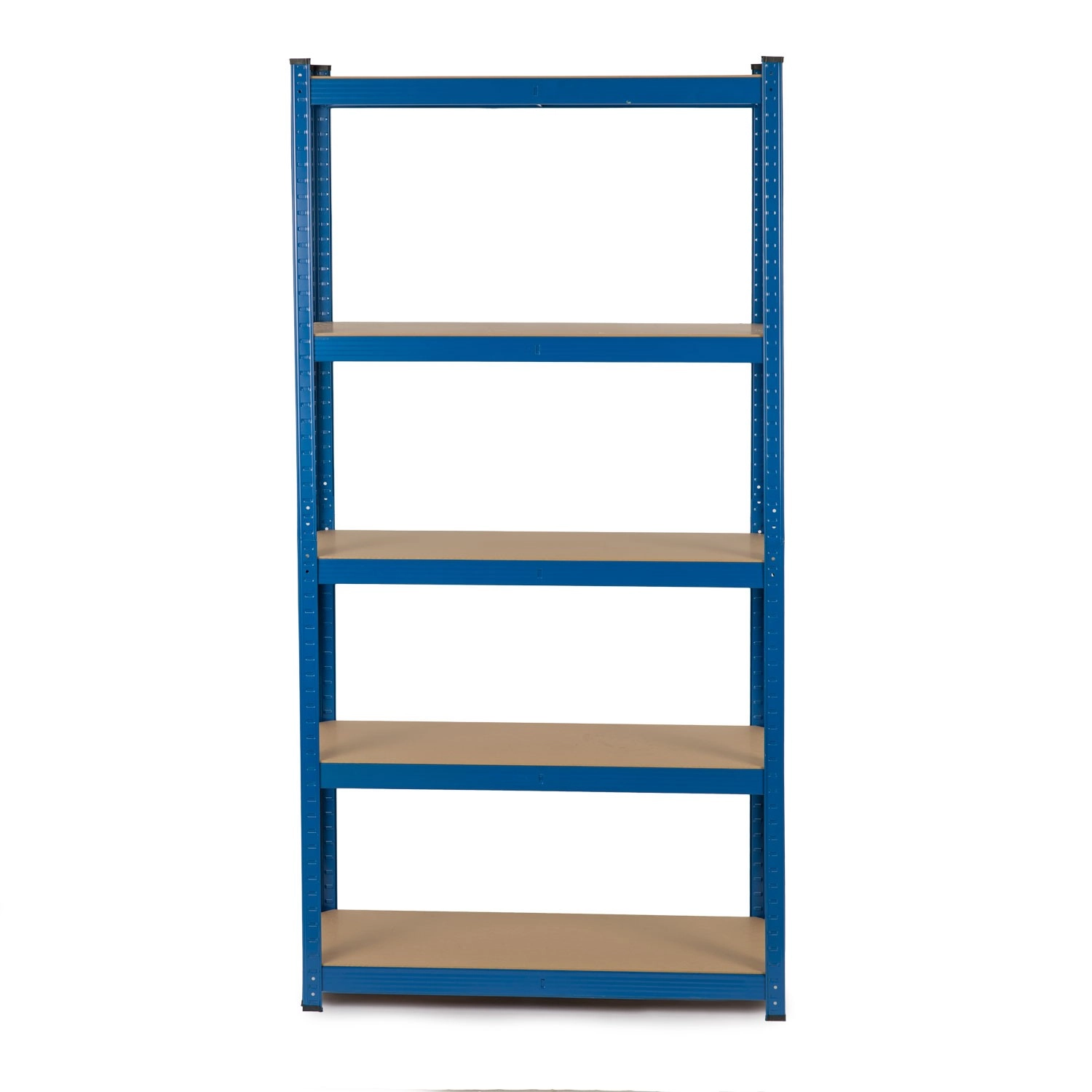 I cinque ripiani in MDF con rinforzi centrali sostengono fino a 175 kg per ripiano (totale 875 kg). I terminali in plastica dei piedi aumentano la stabilità e proteggono il pavimento.