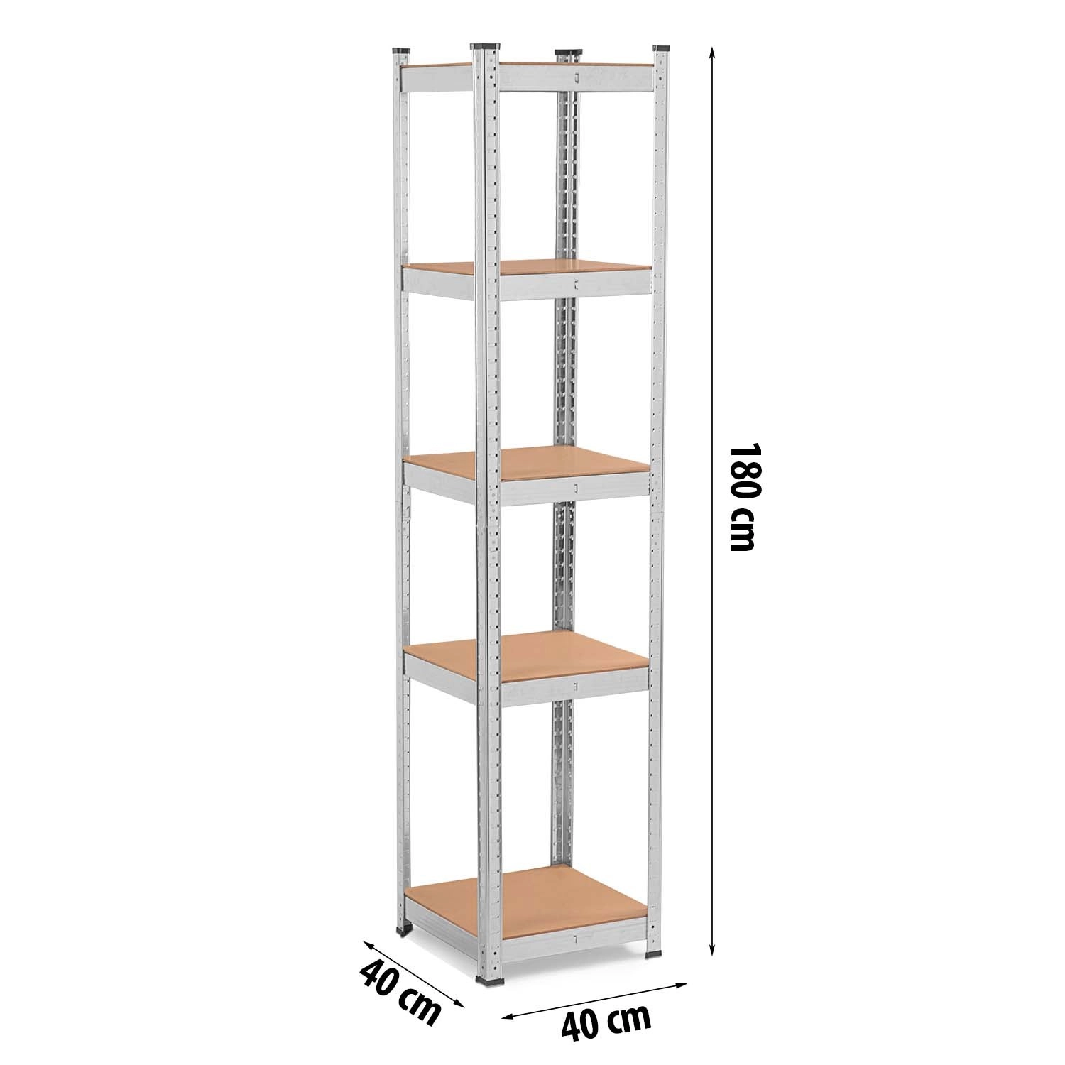Scaffale metallico HUMBERG universale e stabile, dimensioni 180 × 40 × 40 cm, con 5 ripiani robusti in MDF, altezza dei ripiani regolabile a passi di 40 mm e portata totale fino a 500 kg. Perfetto per garage, cantina, archivio e officina. Grazie al sistema di montaggio senza viti si assembla rapidamente; i bordi arrotondati aumentano la sicurezza e i terminali in plastica proteggono il pavimento.