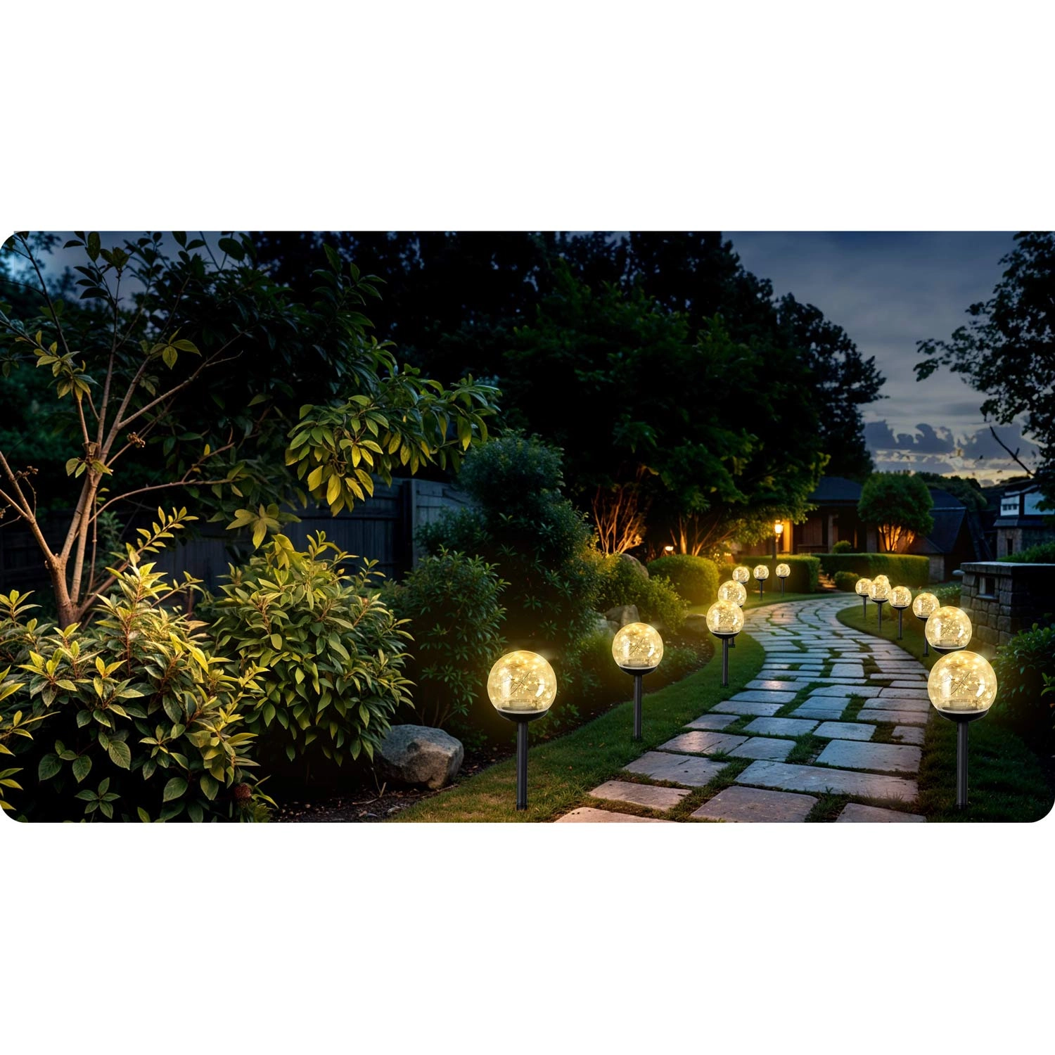 L'installazione è rapida e senza cavi: basta infilarle nel terreno ed è fatta. Le luci sono resistenti agli spruzzi d'acqua (IPX4), quindi affrontano pioggia e umidità. Il sensore crepuscolare accende automaticamente le luci dopo il calare del sole e il pulsante ON/OFF ti dà il controllo quando ne hai bisogno.