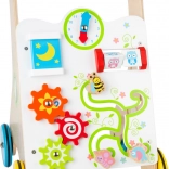 Il girello è dotato di ingranaggi rotanti, gufi e un labirinto colorato per lo sviluppo della motricità fine.