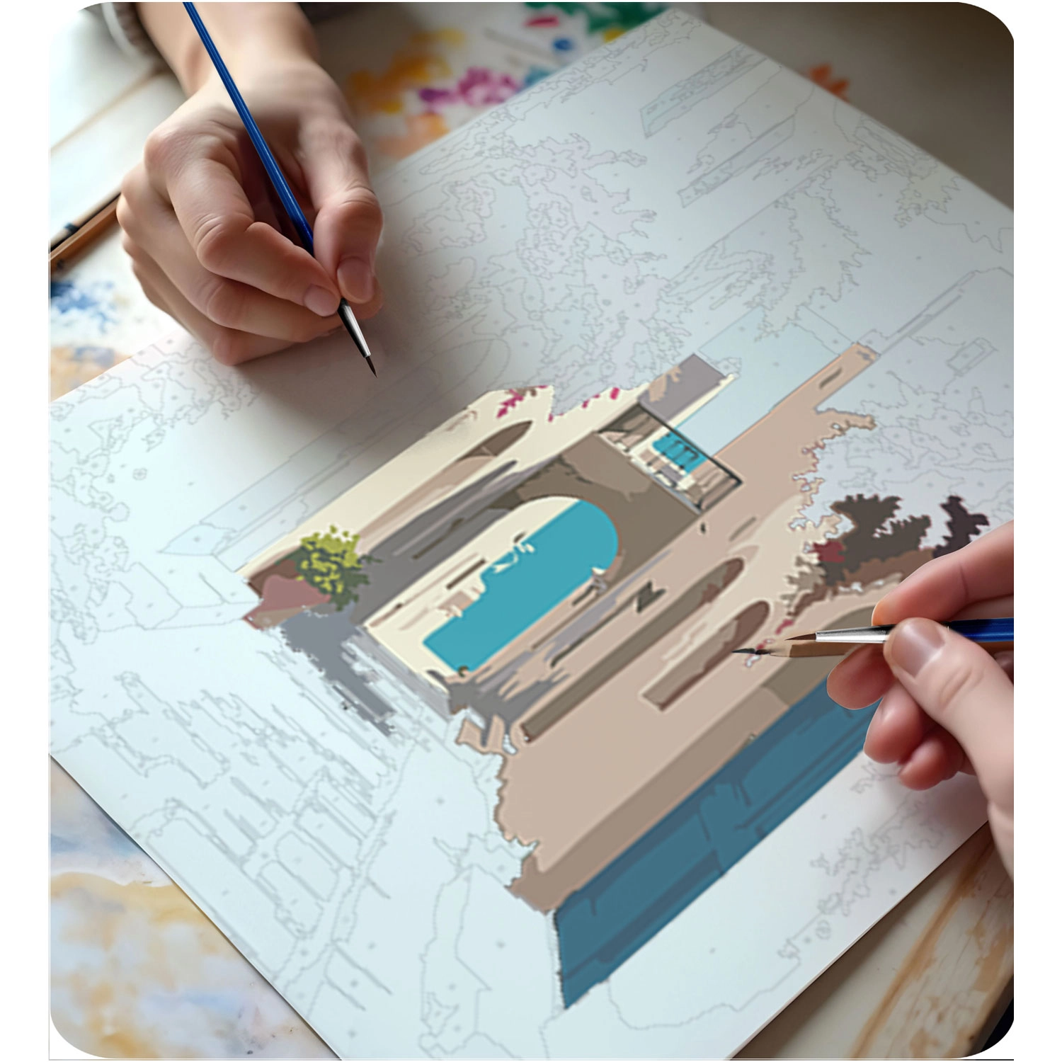 Scopri la gioia della creazione con il set di qualità per il dipinto con i numeri 40 × 50 cm. La tela pre-stampata su telaio, 30 colori acrilici coprenti, 3 pennelli inclusi e il kit per appendere ti semplificano il percorso verso un bellissimo quadro con tema paesaggio urbano – ideale per principianti e avanzati.