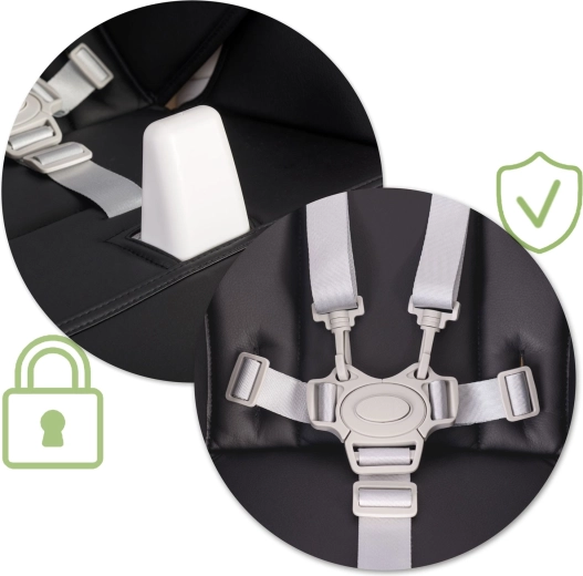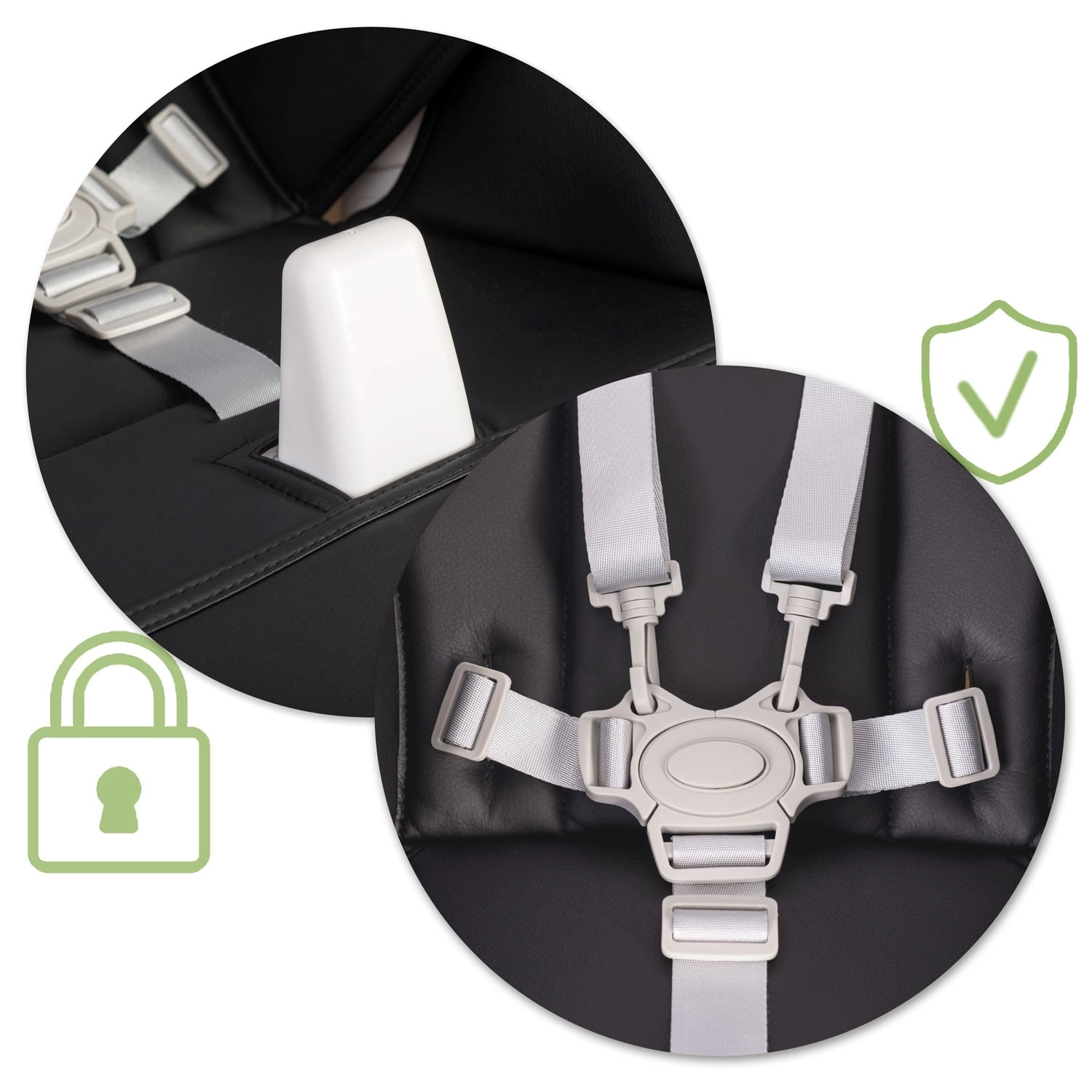 Le cinture a 5 punti regolabili e la cinghia inguinale centrale mantengono il bambino in posizione sicura e impediscono scivolamenti accidentali dal seggiolone.