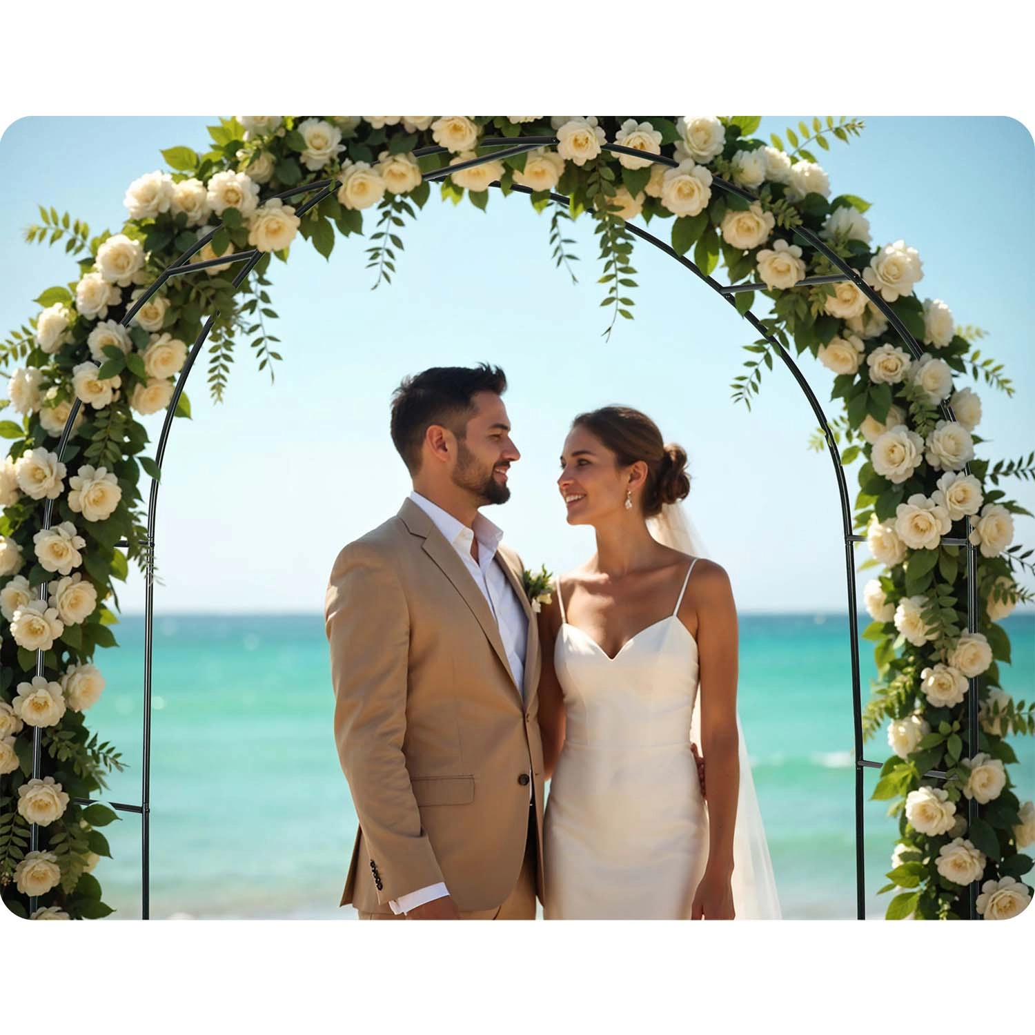 La forma ad arco crea un supporto naturale per rose, edera o vite e si abbina facilmente a catene luminose per un’atmosfera festosa.