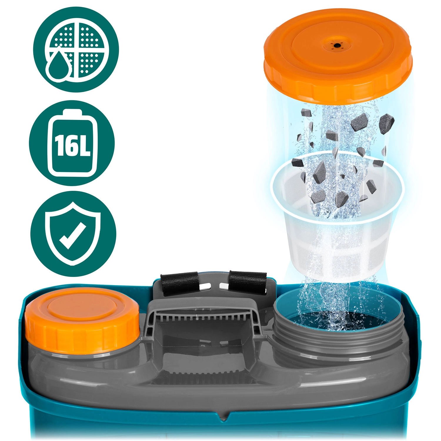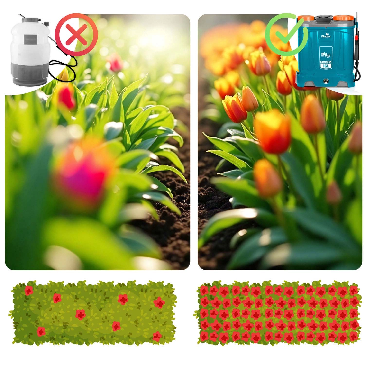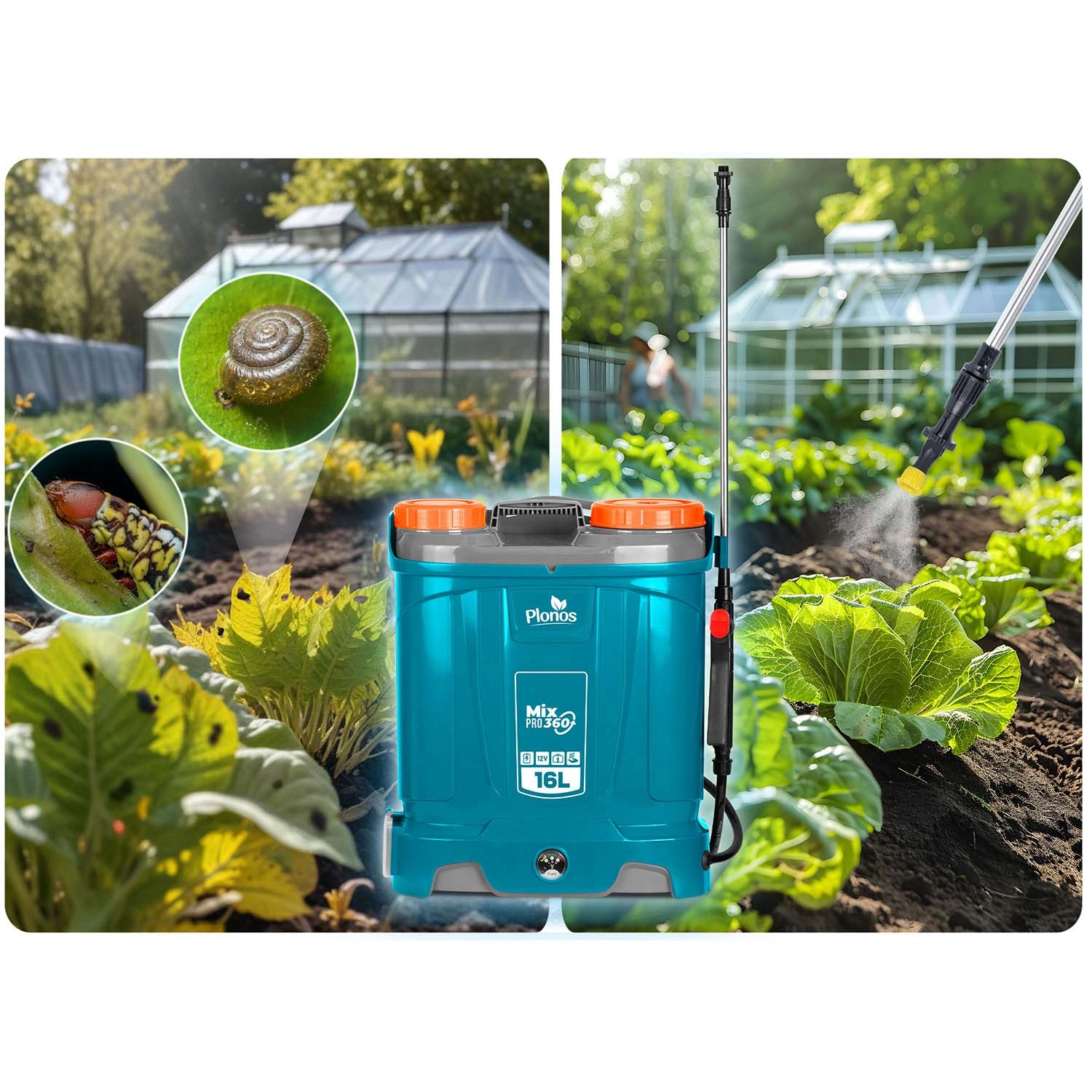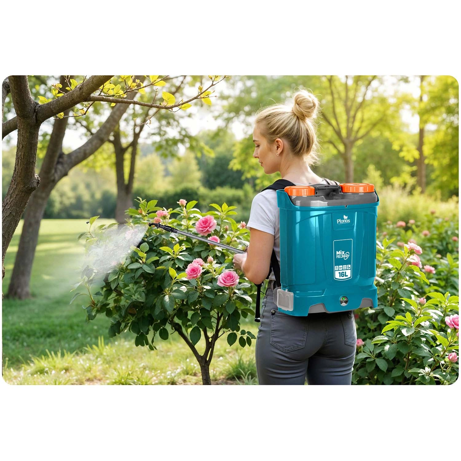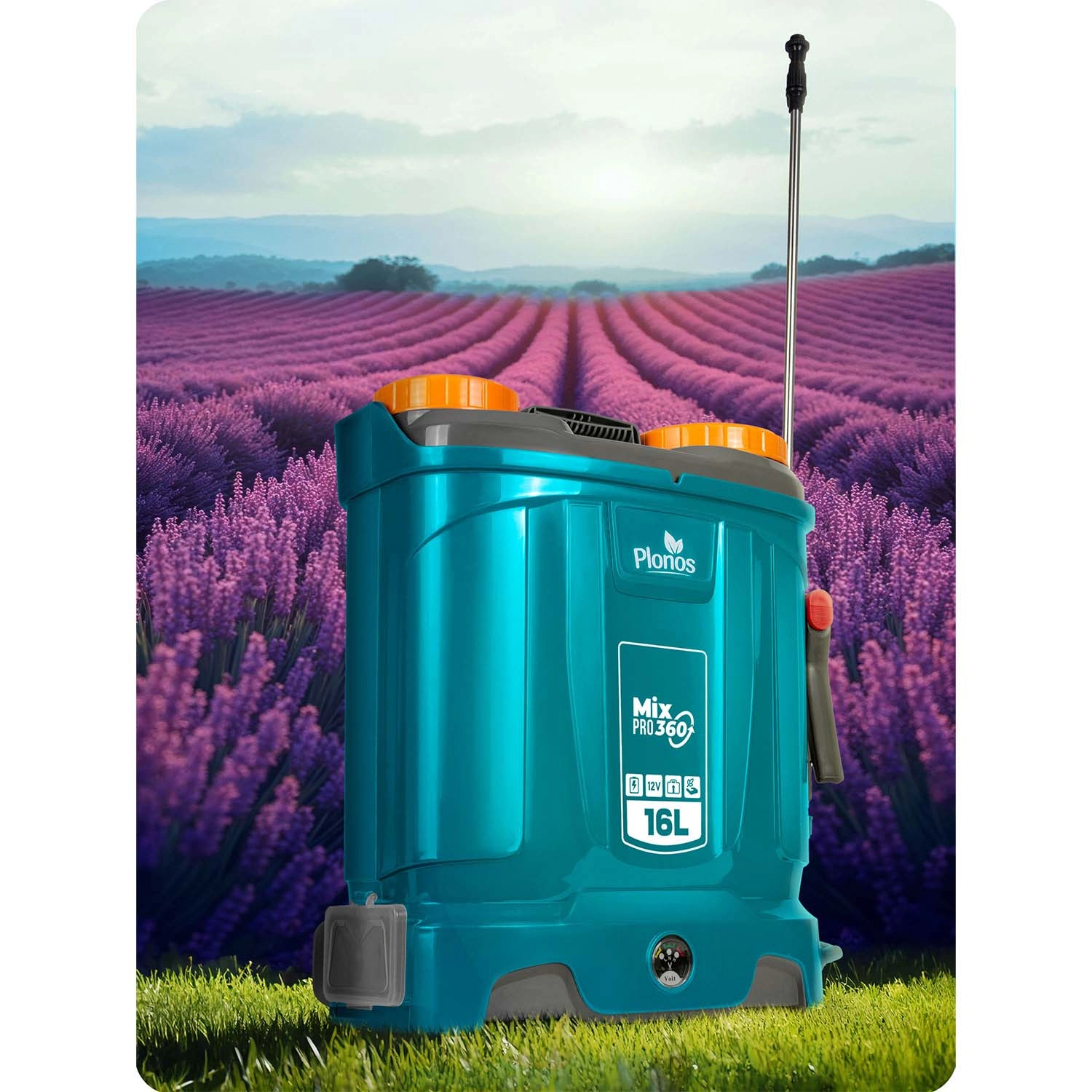 Plonos Mix Pro 360 è un irroratore a zaino a batteria per giardinieri esigenti e professionisti. Capacità 16 l, pressione max 5,5 bar e un ricco set di ugelli consentono sia una nebulizzazione delicata sia un getto mirato per alberi, arbusti e aiuole. Il sistema di miscelazione mantiene il serbatoio costantemente in agitazione, così ogni trattamento ha la stessa concentrazione e le piante ricevono esattamente ciò di cui hanno bisogno.
