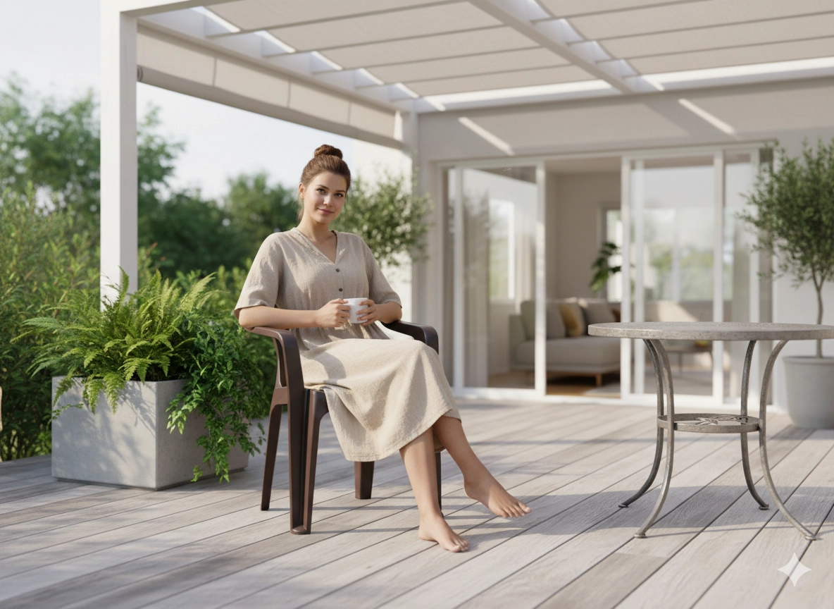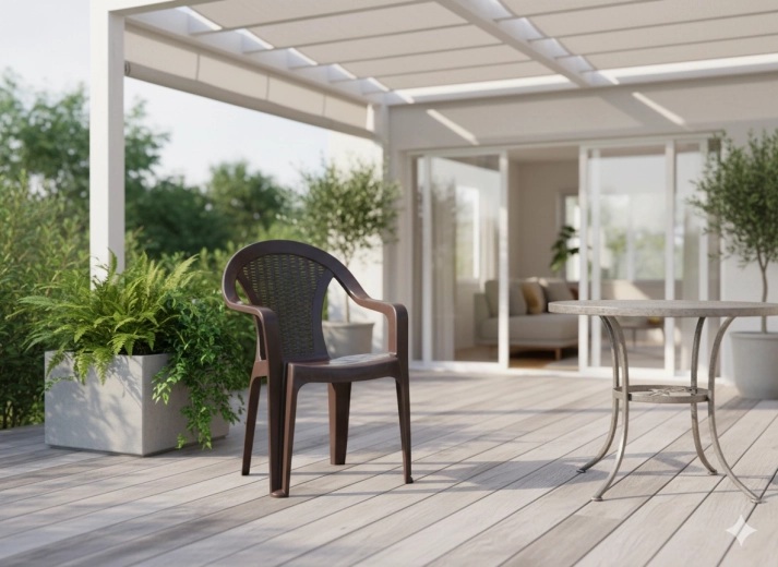 La solida struttura a quattro gambe in plastica assicura stabilità, mentre il peso ridotto facilita lo spostamento e lo stoccaggio su terrazza o in giardino.
