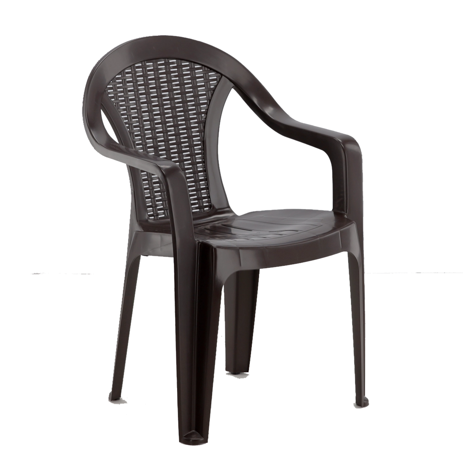 Pratica sedia da giardino marrone in plastica resistente che offre seduta confortevole grazie ai braccioli integrati e alla forma ergonomica. È leggera, stabile e facile da pulire, perfetta per terrazza, balcone e giardino. Lo schienale ventilato con effetto rattan garantisce comfort anche nelle giornate calde e la sedia resiste agli agenti atmosferici per tutta la stagione.