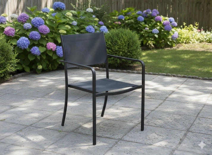 Elegante e resistente, la sedia da giardino nera unisce design minimalista a comfort e praticità. La struttura in acciaio verniciata a polvere garantisce stabilità e resistenza agli agenti atmosferici, mentre il tessilene traspirante 2×1 si asciuga rapidamente ed è confortevole nella seduta. Grazie al design impilabile risparmi spazio durante lo stoccaggio: ideale per terrazze, balconi e caffetterie all’aperto.