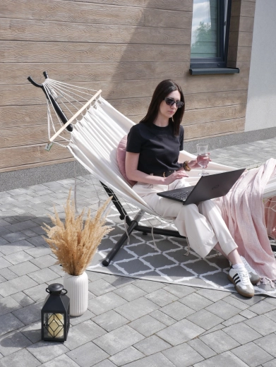 Il robusto tessuto in misto cotone-poliestere è traspirante, resistente e piacevole sulla pelle. Con una portata massima di 120 kg, l’amaca è affidabile per il relax quotidiano in giardino, in terrazza e in casa.