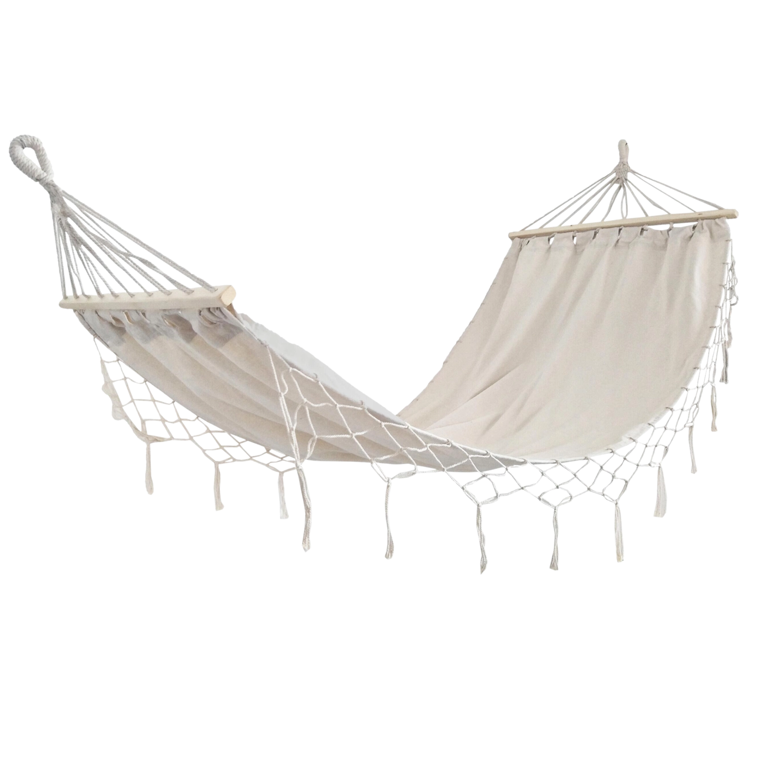Questa amaca beige con frange è una perfetta combinazione di design e funzionalità. La tonalità naturale si abbina facilmente all’arredo da esterno e agli interni, mentre le aste distanziatrici in legno mantengono comodamente aperta la superficie per leggere, riposare o fare un breve pisolino.