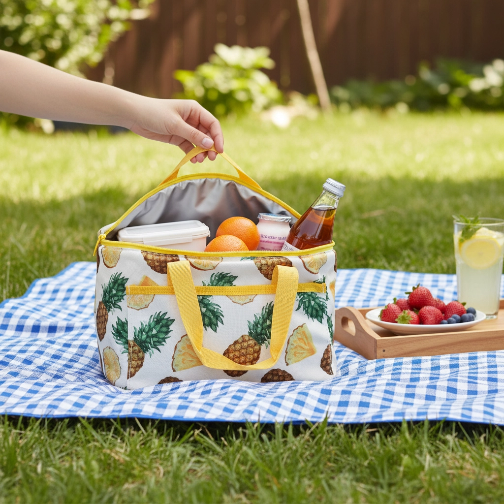 Goditi snack e bevande freschi ovunque tu sia. Questa elegante borsa isotermica da 6 l con accattivante stampa di ananas offre un mix di leggerezza, tessuto resistente ed eccellente isolamento. I due blocchi refrigeranti inclusi prolungano l’effetto di raffreddamento durante le giornate calde.