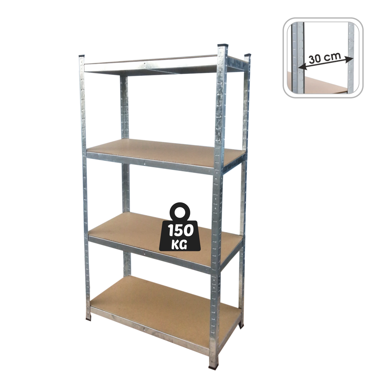 Ogni ripiano sopporta fino a 150 kg. Le travi metalliche e i rinforzi sotto ogni ripiano assicurano affidabilità anche per oggetti più pesanti.