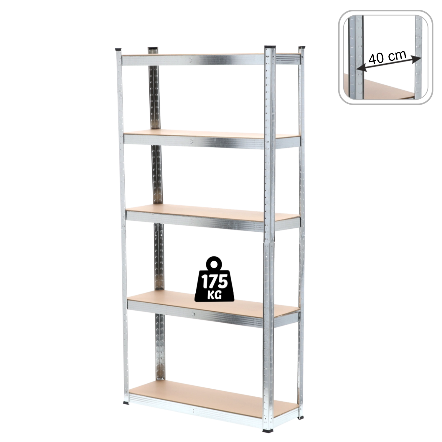 Robusto scaffale a cinque ripiani che combina profili in acciaio zincato e pannelli in MDF per una lunga durata e un deposito sicuro di utensili, scatole e scorte. L’altezza dei ripiani regolabile consente di sfruttare efficacemente lo spazio verticale e di adattare lo scaffale a oggetti di varie dimensioni. I rinforzi sotto ogni ripiano aumentano la rigidità della struttura e garantiscono stabilità anche con carichi più elevati.