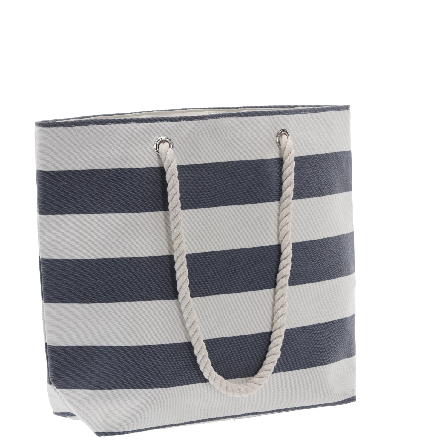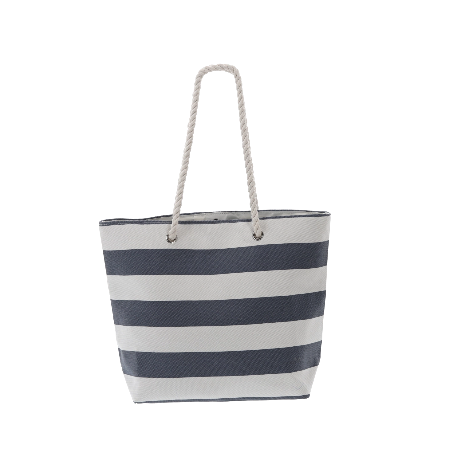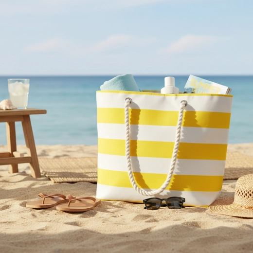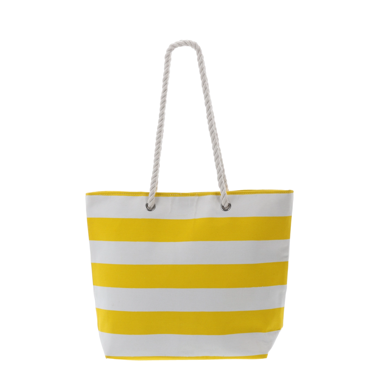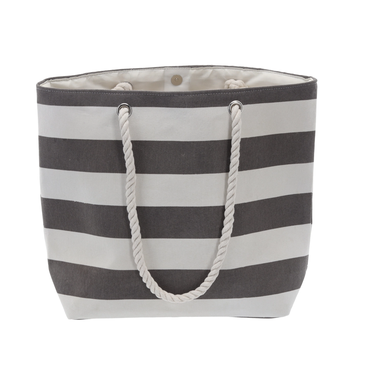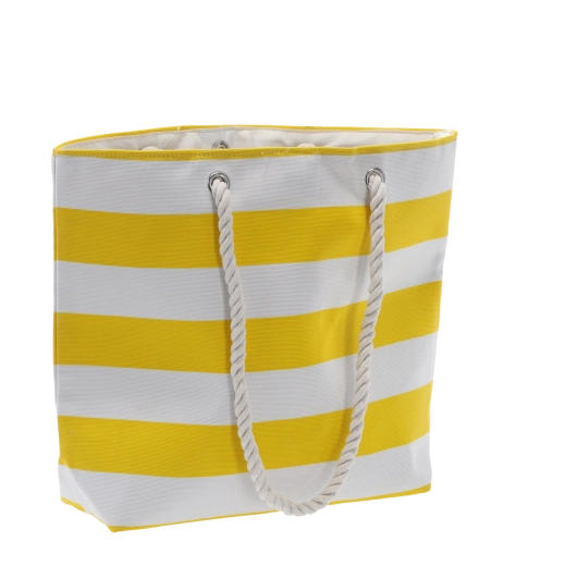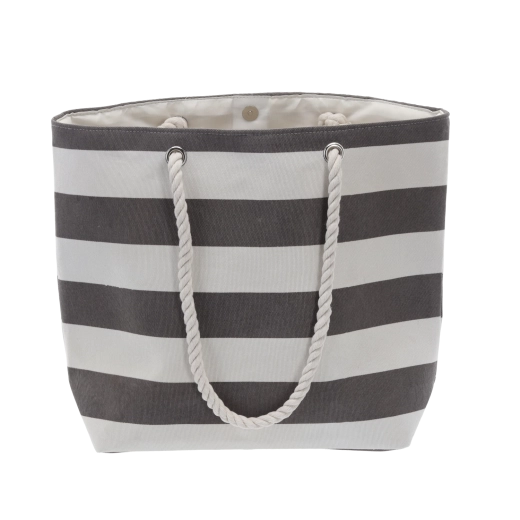 Questa ampia borsa da spiaggia a righe in stile estivo contiene asciugamano, crema solare, libro e altri indispensabili. I robusti manici in corda attorcigliata sono confortevoli sulla spalla e gli occhielli in metallo aumentano la resistenza nell’uso quotidiano. Alcune varianti hanno una tasca interna e chiusura con bottone a pressione per riporre in sicurezza i piccoli oggetti.