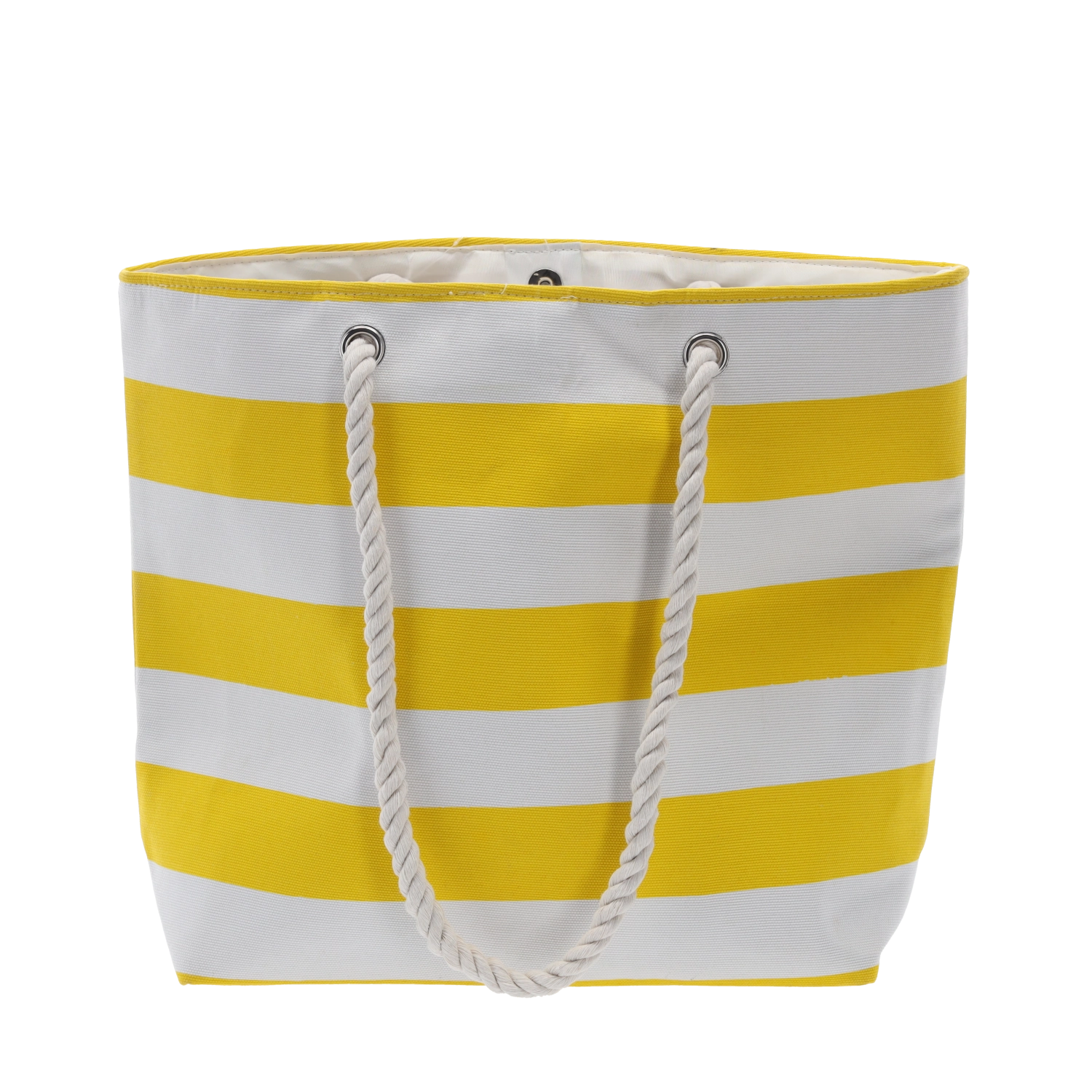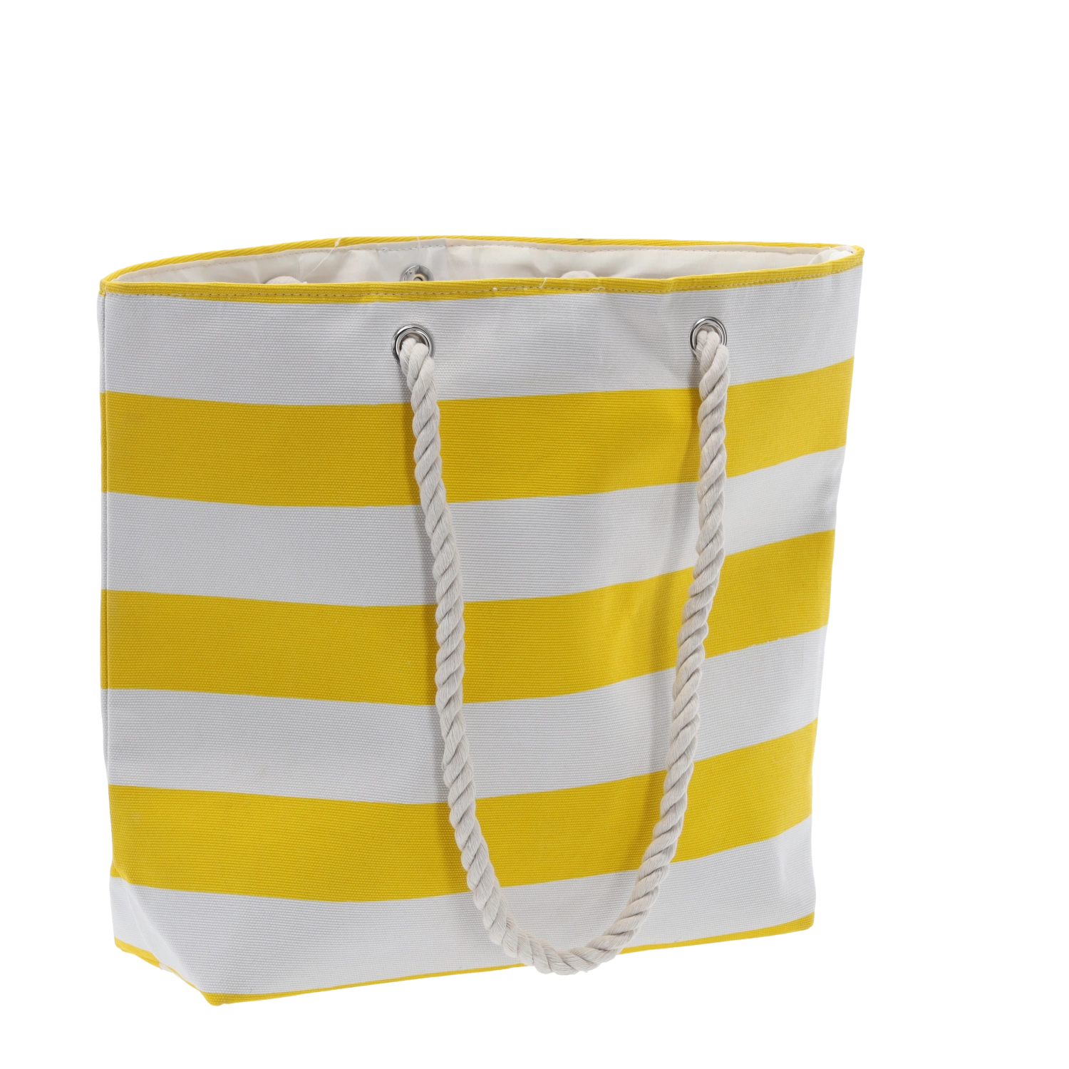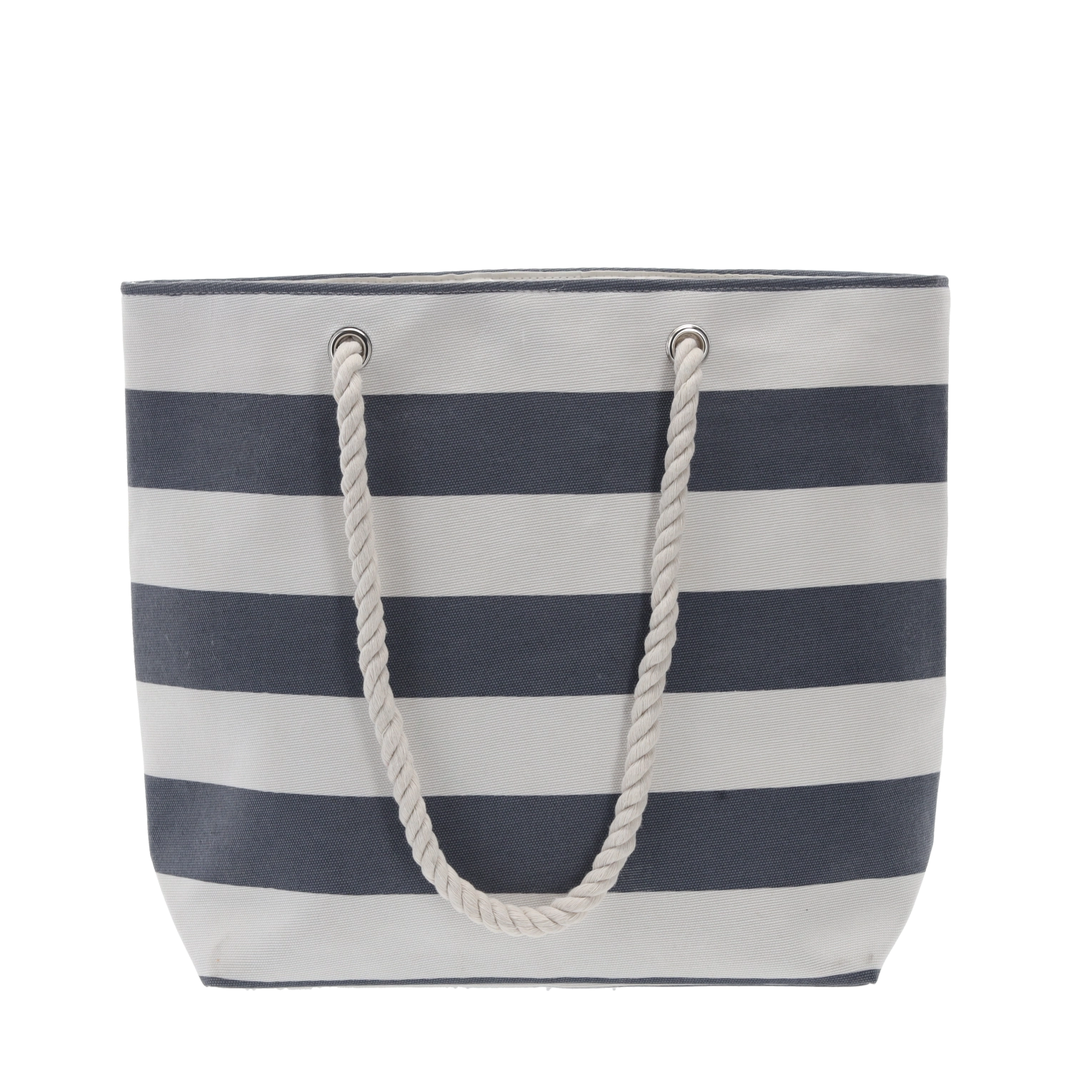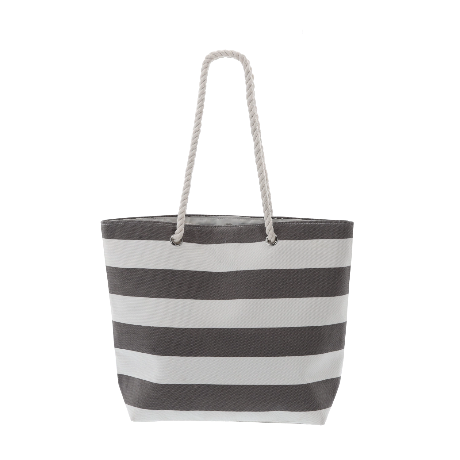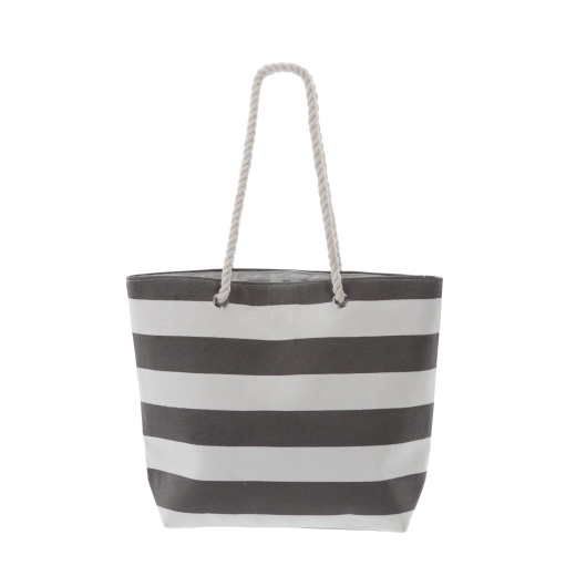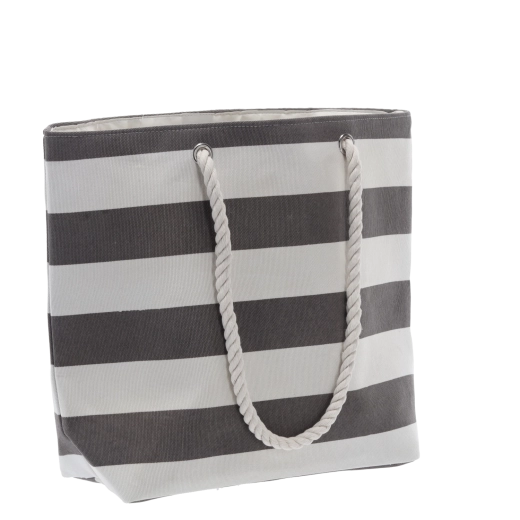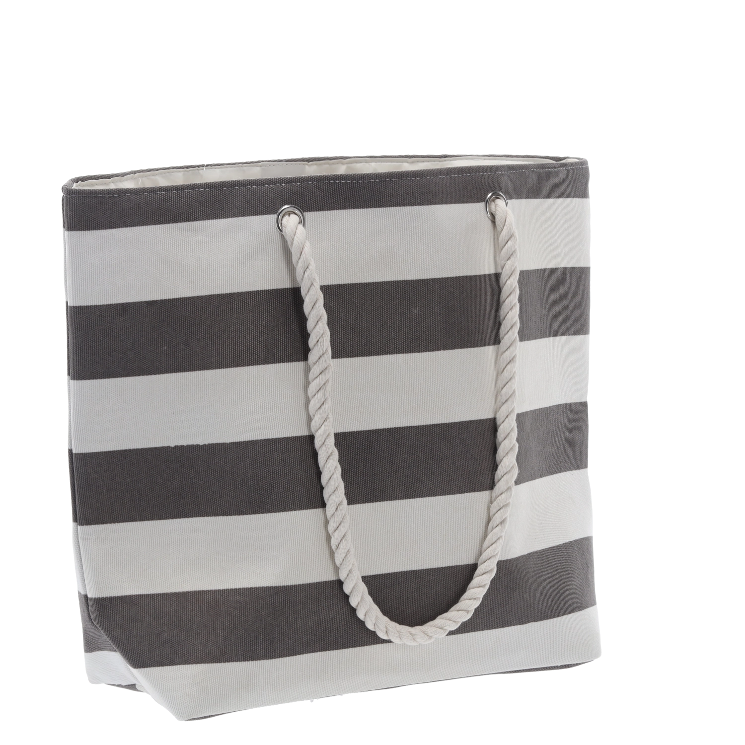 Questa ampia borsa da spiaggia a righe in stile estivo contiene asciugamano, crema solare, libro e altri indispensabili. I robusti manici in corda attorcigliata sono confortevoli sulla spalla e gli occhielli in metallo aumentano la resistenza nell’uso quotidiano. Alcune varianti hanno una tasca interna e chiusura con bottone a pressione per riporre in sicurezza i piccoli oggetti.
