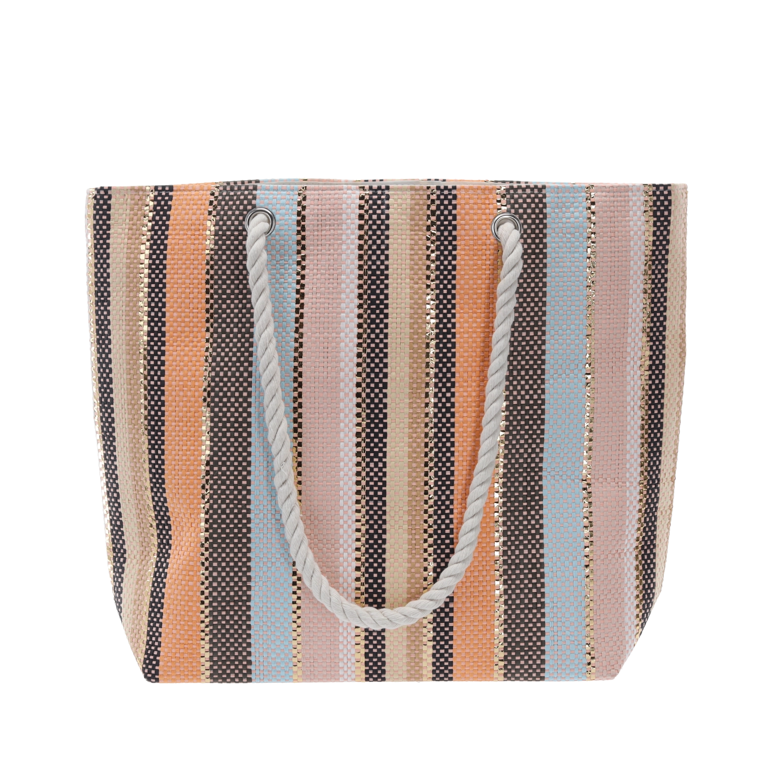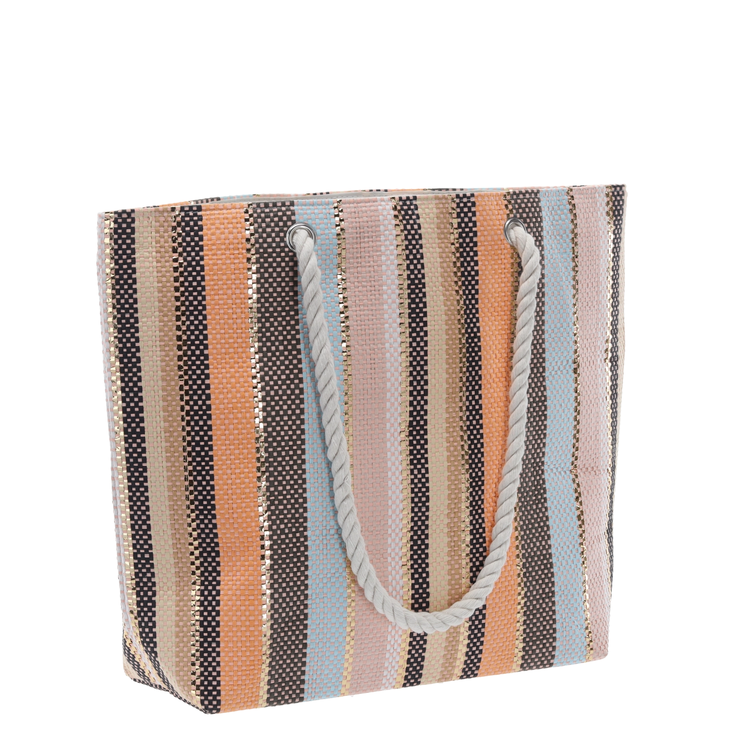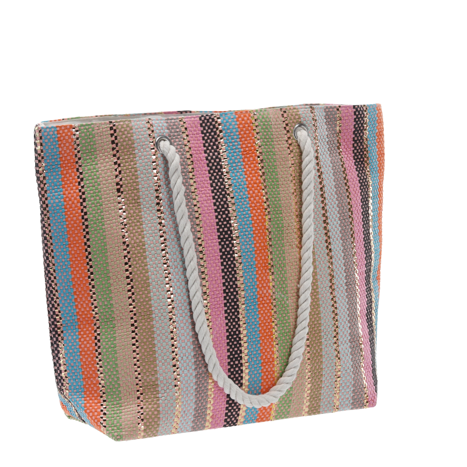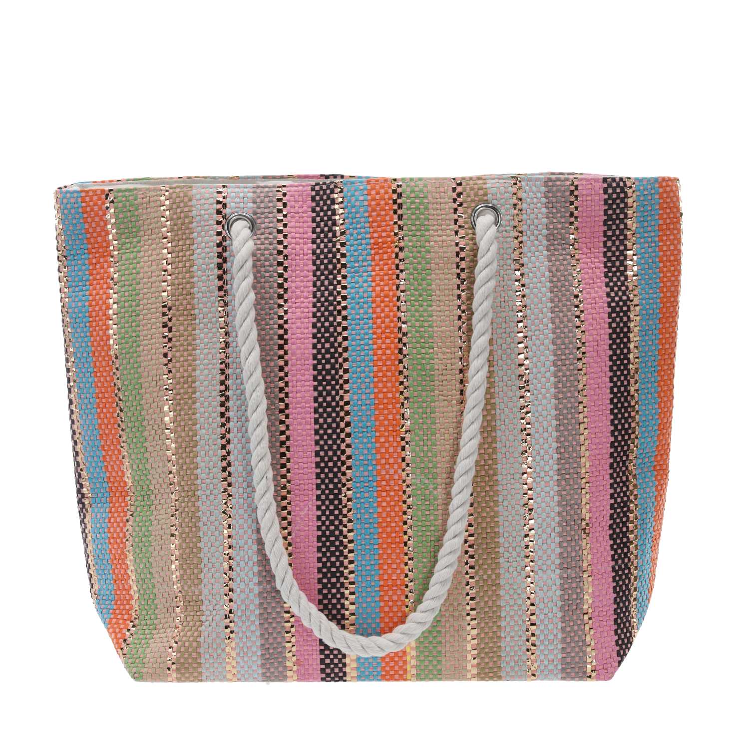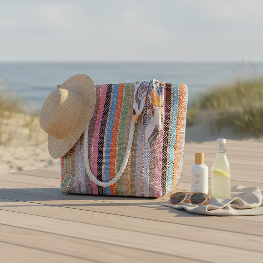 Borsa da spiaggia elegante e pratica con righe multicolori e robuste maniglie in corda, offre spazio sufficiente per asciugamano, crema solare e bottiglia d'acqua. Grazie alla struttura leggera e all'ampia apertura superiore è ideale per la spiaggia, lo shopping e le gite estive.