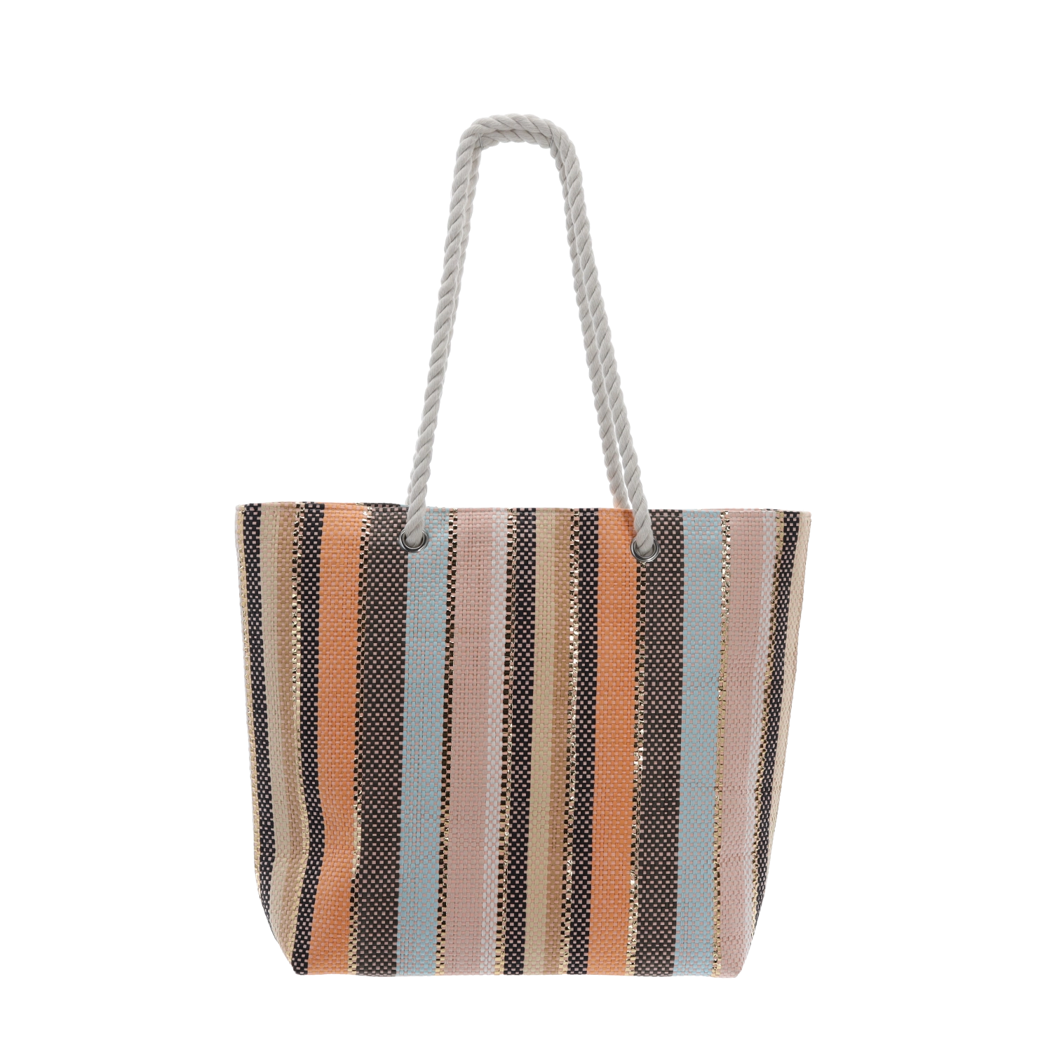 Questa capiente borsa da spiaggia si distingue per il fresco design a righe e le comode maniglie in corda per il trasporto a spalla. L’ampia apertura superiore garantisce accesso rapido agli oggetti, mentre il corpo in tessuto più consistente mantiene la forma e la leggerezza per un uso quotidiano.