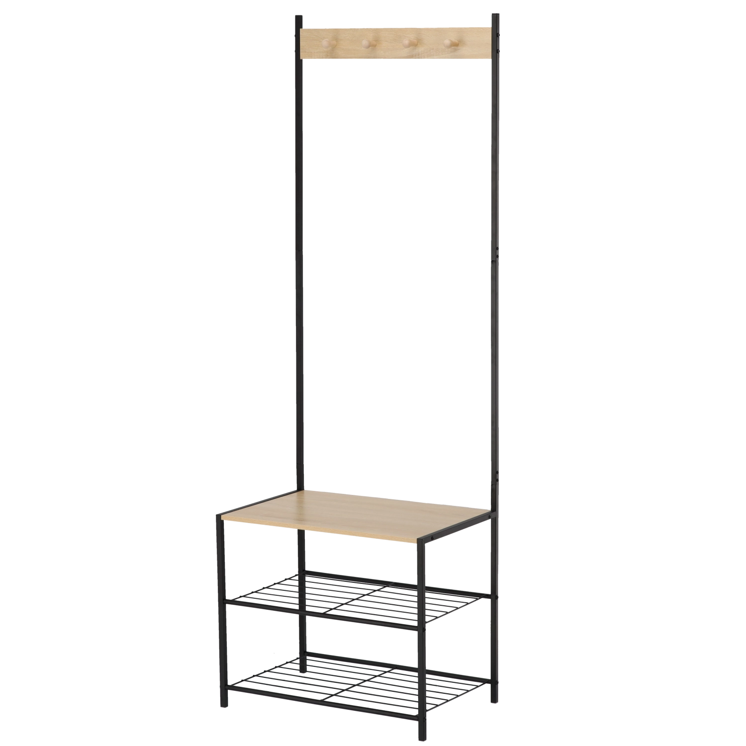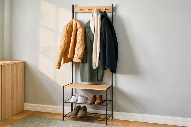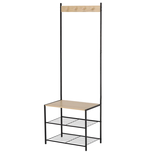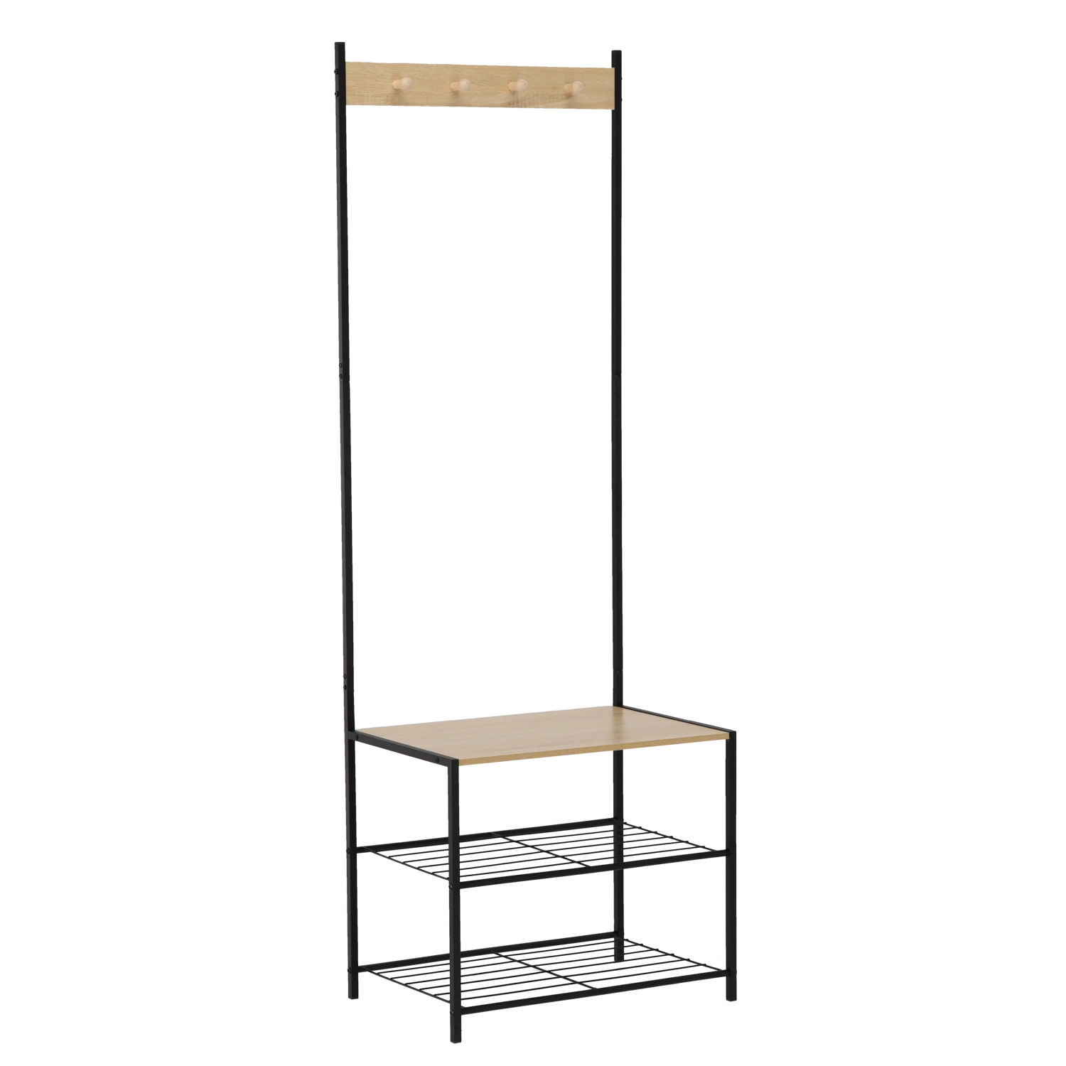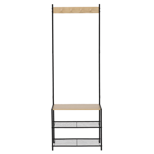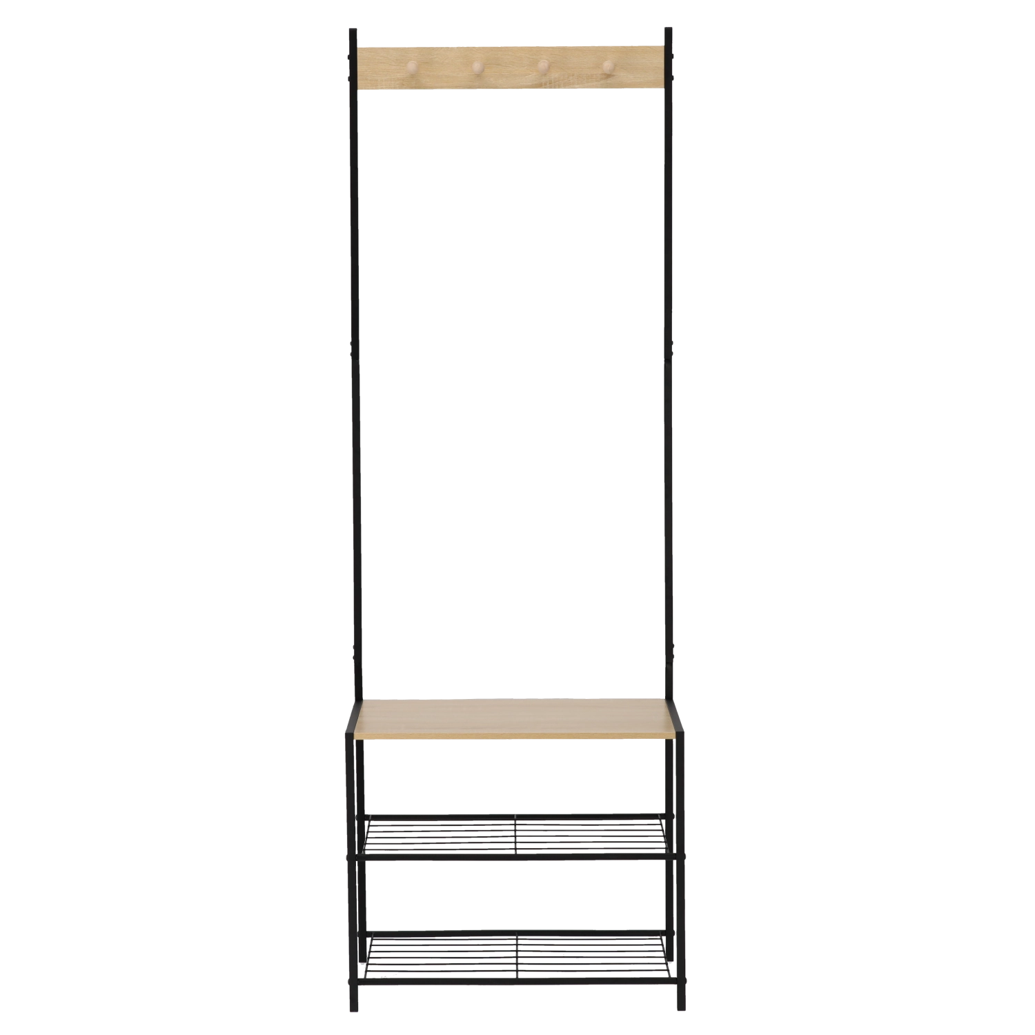 Il telaio massiccio in metallo verniciato garantisce stabilità e lunga durata, mentre gli accenti in legno aggiungono un caldo look loft. I due ripiani metallici inferiori ospitano diverse paia di scarpe, mentre la barra superiore con ganci mantiene giacche, sciarpe e borse in ordine in un solo posto.