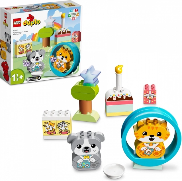 Il set LEGO DUPLO Il mio primo cagnolino e gattino con suoni (10977) permette ai bambini da 1,5 anni di esplorare il mondo attraverso il gioco. I simpatici modelli animali di un cagnolino e di un gattino si possono montare facilmente con pochi mattoncini. Posizionando gli animali nel cerchio rotante, si attivano i suoni che aiutano i più piccoli ad imparare le azioni quotidiane come nutrirsi, giocare o dormire.