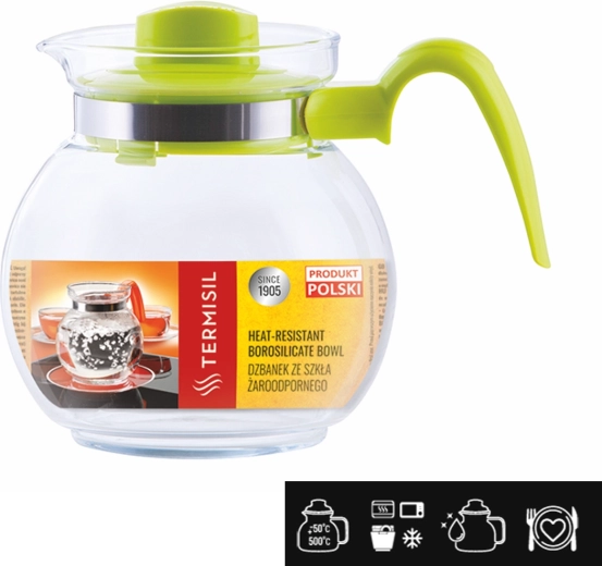 La brocca resistente al calore TERMISIL Maja 1,5 l è un aiuto pratico per servire quotidianamente tè, caffè, limonate e sciroppi fatti in casa. Il vetro borosilicato a pareti sottili è leggero, resistente e sicuro quando si versa acqua bollente. Grazie all’inerzia chimica del materiale, le bevande mantengono gusto e aroma puri.