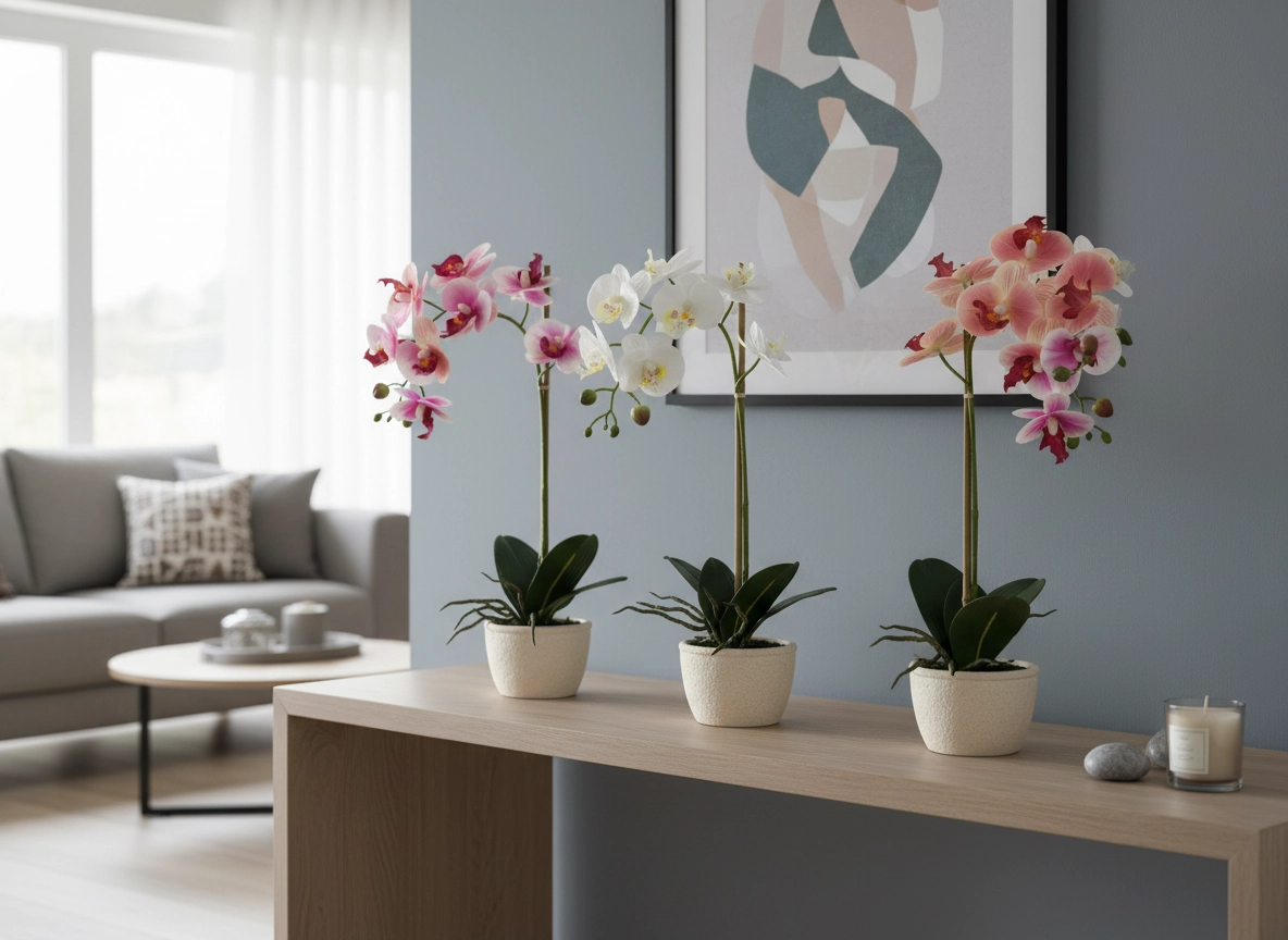 Petali delicati, boccioli decorativi e foglie intense imitano fedelmente l’orchidea vera, conferendo all’ambiente un aspetto lussuoso senza sforzo.