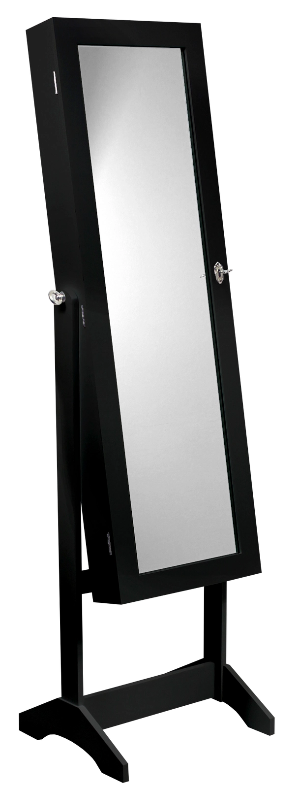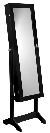 Questa gioielliera nera con alto specchio autoportante è una soluzione ideale per camera da letto e cabina armadio. Offre spazio a sufficienza per orecchini, collane, anelli e orologi, mentre lo specchio a piena lunghezza facilita la scelta dell’outfit e il make-up. Il design minimalista si integra facilmente in un interno moderno.