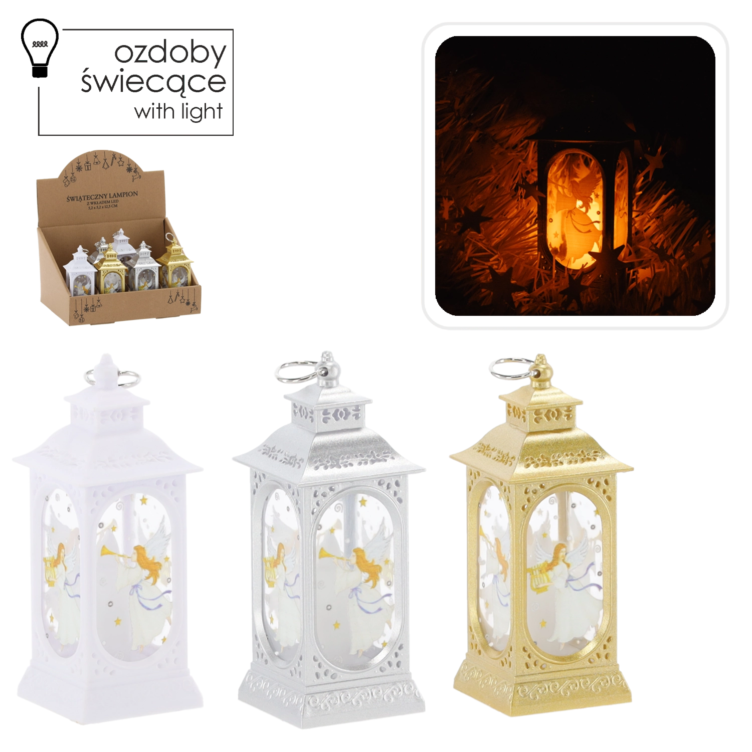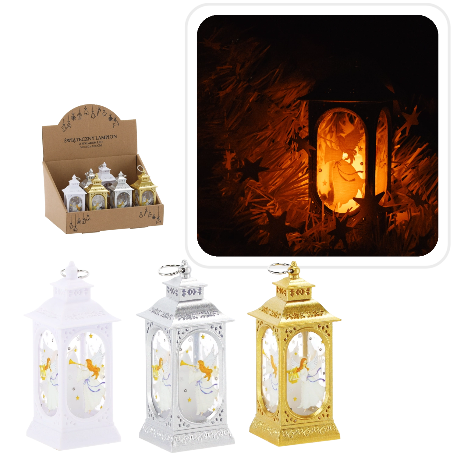 Lanterna natalizia con angelo LED, argento/oro/bianco, 5,2 × 5,2 × 12,5 cm