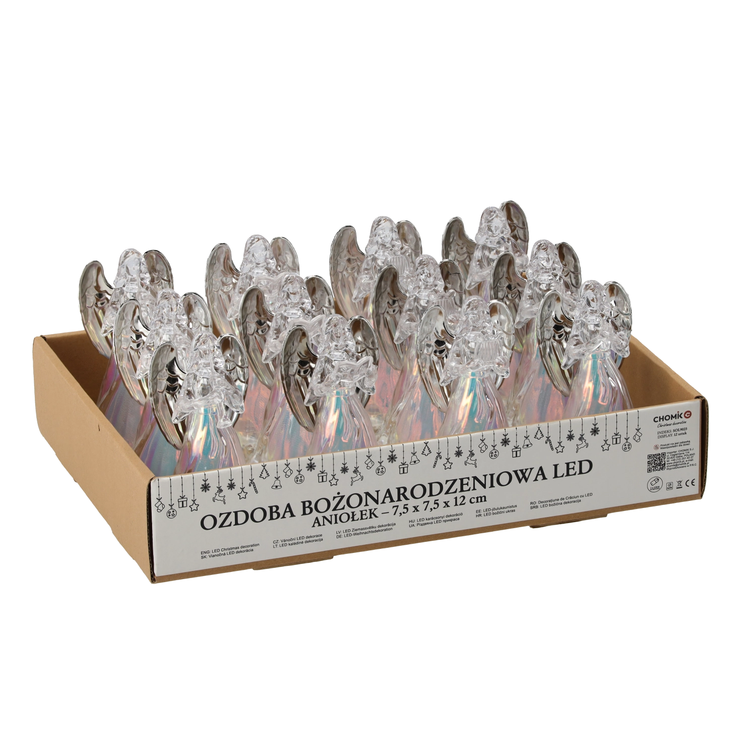 Questo angelo LED è un addobbo stagionale d'eccezione che illuminerà la tua casa con luce bianco freddo. La finitura iridescente madreperlata crea un effetto scenografico che cambia in base all'angolo di osservazione. Le ali argentate sottolineano l'aspetto elegante e aggiungono delicatezza e charme all'addobbo natalizio.