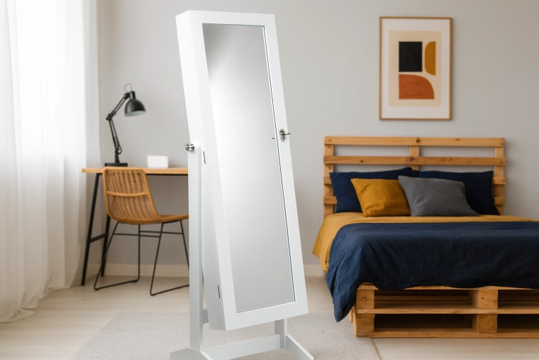 Grazie alla struttura snella e alla base stabile risparmia spazio e allo stesso tempo offre un riflesso a figura intera per provare comodamente gli outfit. Il design minimalista bianco si abbina facilmente sia agli interni moderni che classici: un accento di stile che valorizza camera da letto e cabina armadio.