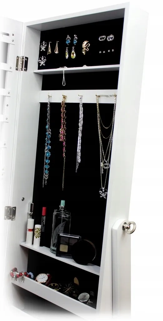 All’interno trovi ganci per collane, slot per orecchini, barre per anelli, ripiani per orologi e cosmetici — tutto ben visibile in un unico posto.
