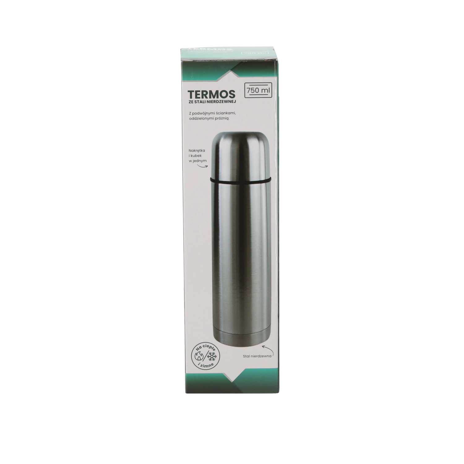 Pratico thermos da 750 ml con doppia parete in acciaio inox che mantiene le bevande calde o fredde a lungo. Offre un'eccellente isolamento termico – dopo 24 ore la bevanda resta intorno a 40–43 °C. Dimensioni ergonomiche e lavorazione di qualità garantiscono resistenza e un uso confortevole a casa, al lavoro e in viaggio.